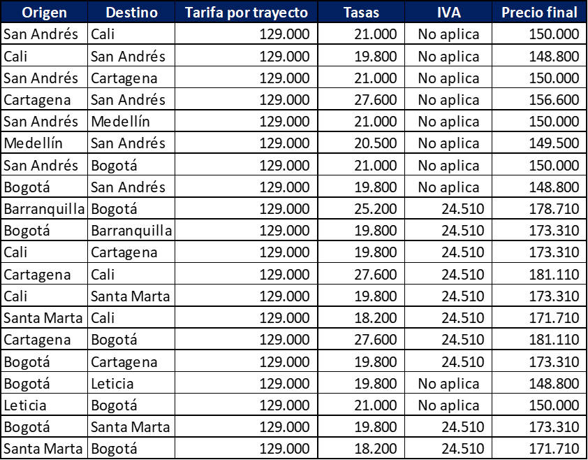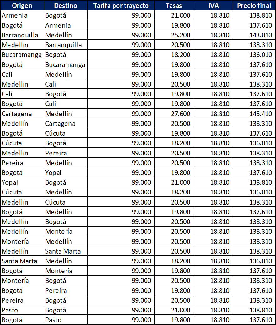 Estas tarifas podrán adquirirse en los aeropuertos donde LATAM Airlines Colombia realiza venta de tickets. No incluye Pereira, Cúcuta, Armenia y Pasto.
