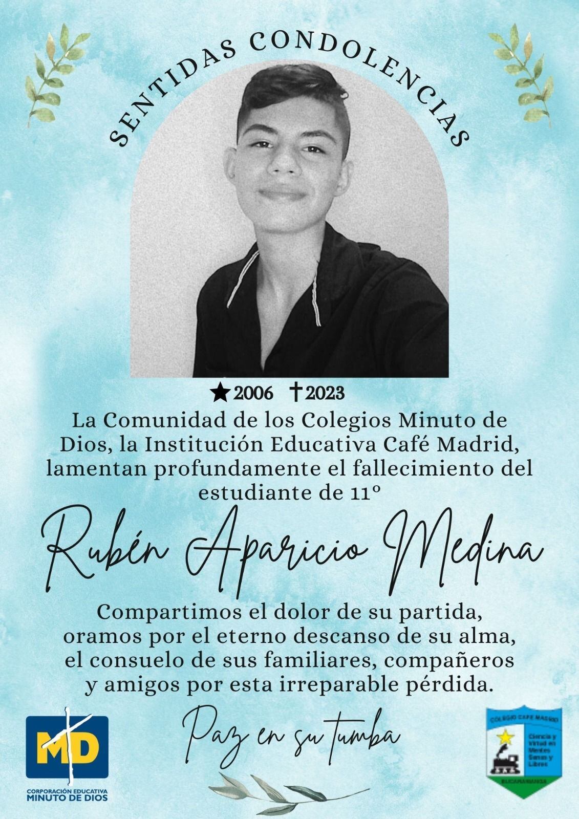 En luto se encuentran sus familiares, amigos y también la institución educativa donde estudiaba; Aida Consuelo Ramírez Robayo, la rectora del colegio Café Madrid, señaló que era un estudiante empático, deportivo y multifacético.