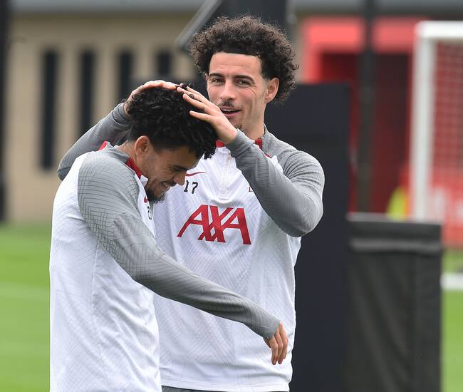 Luis Díaz bromea junto a Curtis Jones. (Photo by John Powell/Liverpool FC via Getty Images) / John Powell