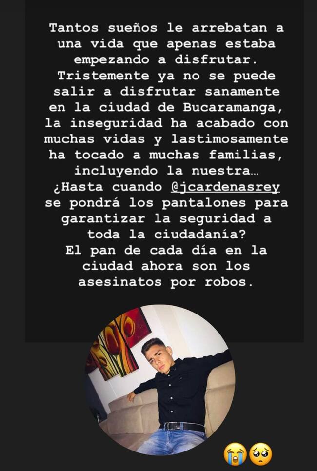 “Tantos sueños le arrebatan a una vida que apenas estaba empezando a disfrutar. Tristemente, ya no se puede salir a disfrutar sanamente en la ciudad de Bucaramanga, la inseguridad ha acabado con muchas vidas y lastimosamente ha tocado a muchas familias, incluyendo a la nuestra... ¿Hasta cuando @jcardenasrey se pondrá los pantalones para garantizar la seguridad a toda la ciudadanía? El pan de cada día en la ciudad ahora son los asesinatos por robos.” Aseguran los familiares de Nicolás.