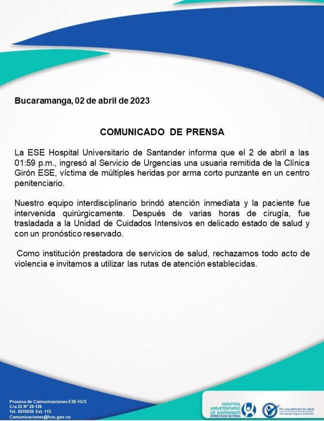 “Una usuaria es remitida de la Clínica Girón ESE, víctima de múltiples heridas por arma corto punzante.”