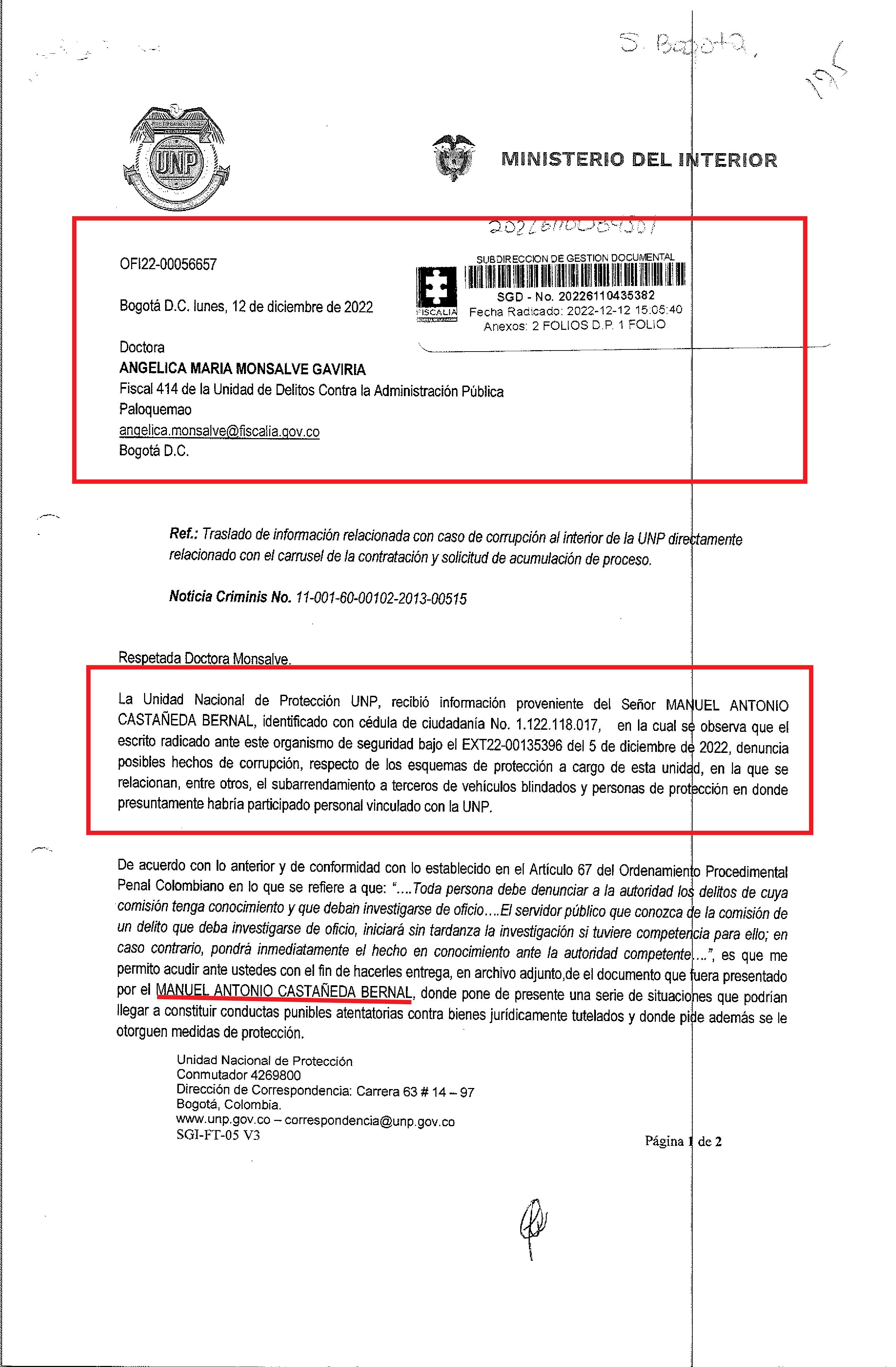 Y por último, otra irregularidad tiene que ver con la denuncia del ‘narco-chofer’ Castañeda que involucra a Wilson Devia. Ese documento fue radicado ante el director de la UNP, pero el asesor jurídico de esa entidad no remitió la compulsa de copias a la oficina de denuncias de la Fiscalía como indica el procedimiento, sino que, sin explicación alguna, la remitió directamente a la fiscal Angelica Monsalve.