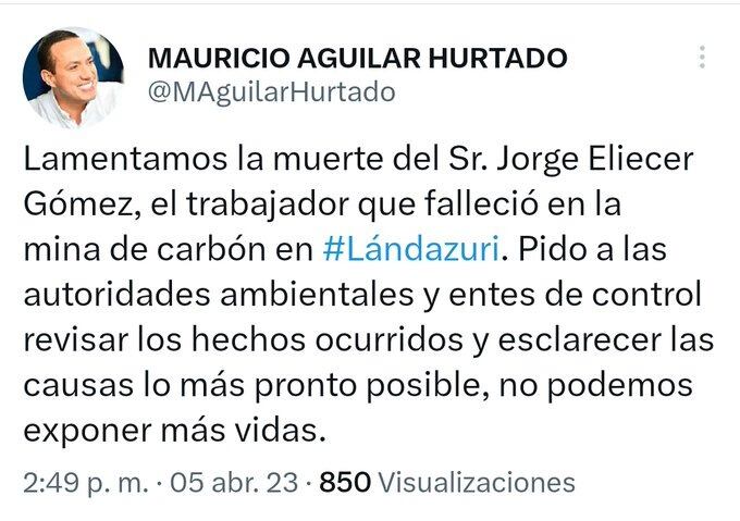 “Lamentamos la muerte del Sr. Jorge Eliecer Gómez, el trabajador que falleció en la mina de carbón en #Lándazuri. Pido a las autoridades ambientales y entes de control, revisar los hechos ocurridos y esclarecer las causas lo más pronto posible, no podemos exponer más vidas.”