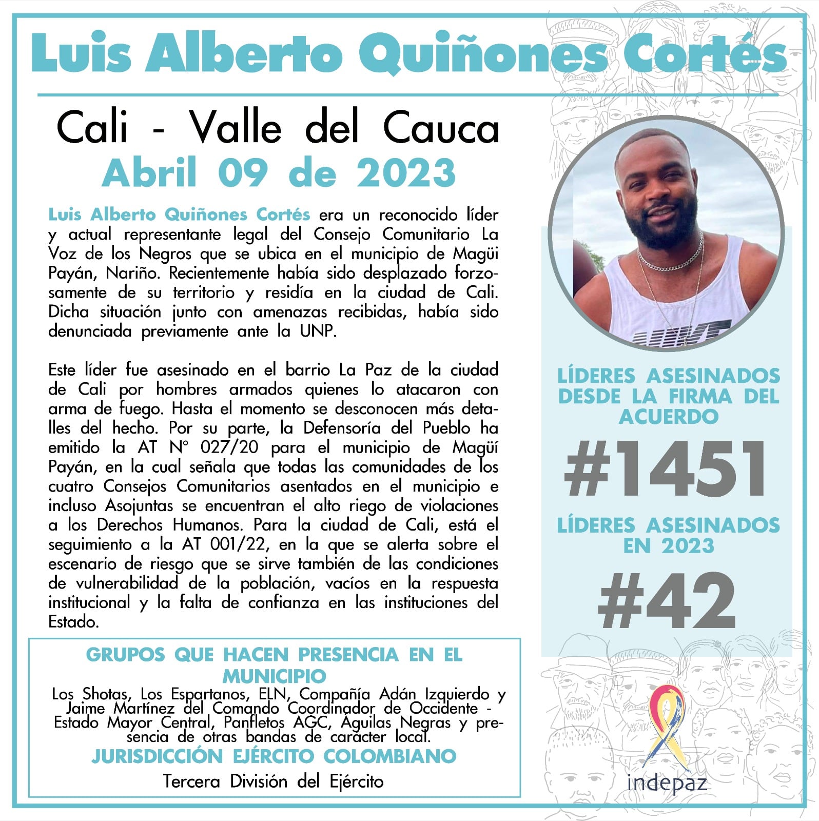 En el barrio La Paz al Oriente de la Ciudad de Cali, fue atacado por hombres armados Luis Alberto Quiñones Cortés quien era un reconocido líder y representante legal del Consejo Comunitario La Voz de los Negros en el municipio de Magui Payán en el departamento de Nariño.