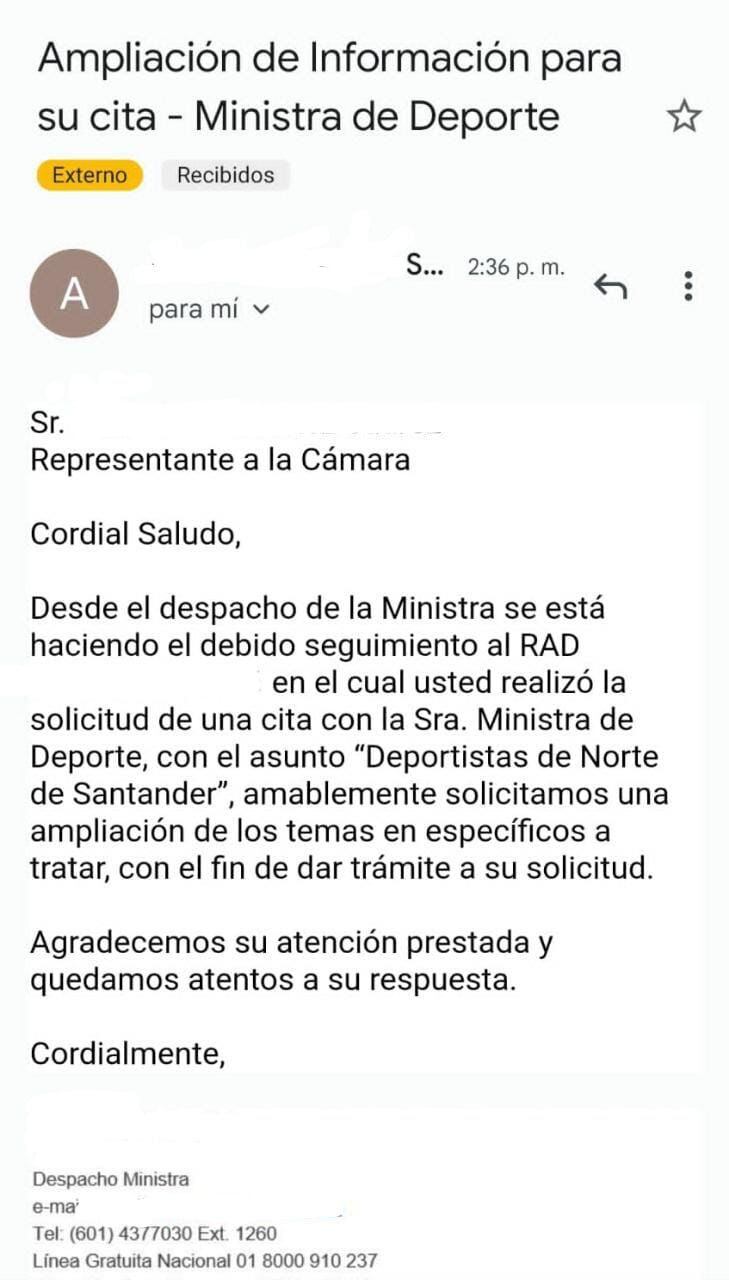 “Desde el despacho de la ministra se está haciendo el debido seguimiento al radicado en el cual usted realizó la solicitud de una cita con la Sra. ministra de Deporte, con el asunto “Deportistas de Norte de Santander”. Amablemente solicitamos una ampliación de los temas en específico a tratar”, dice uno de los mensajes conocidos por La W.