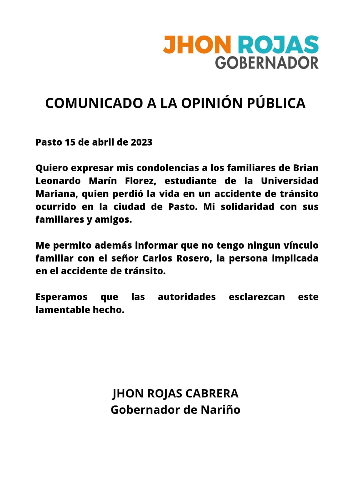 Por su parte el gobernador de Nariño, John Rojas en un comunicado, también negó tener parentesco con los implicados en dicho accidente.