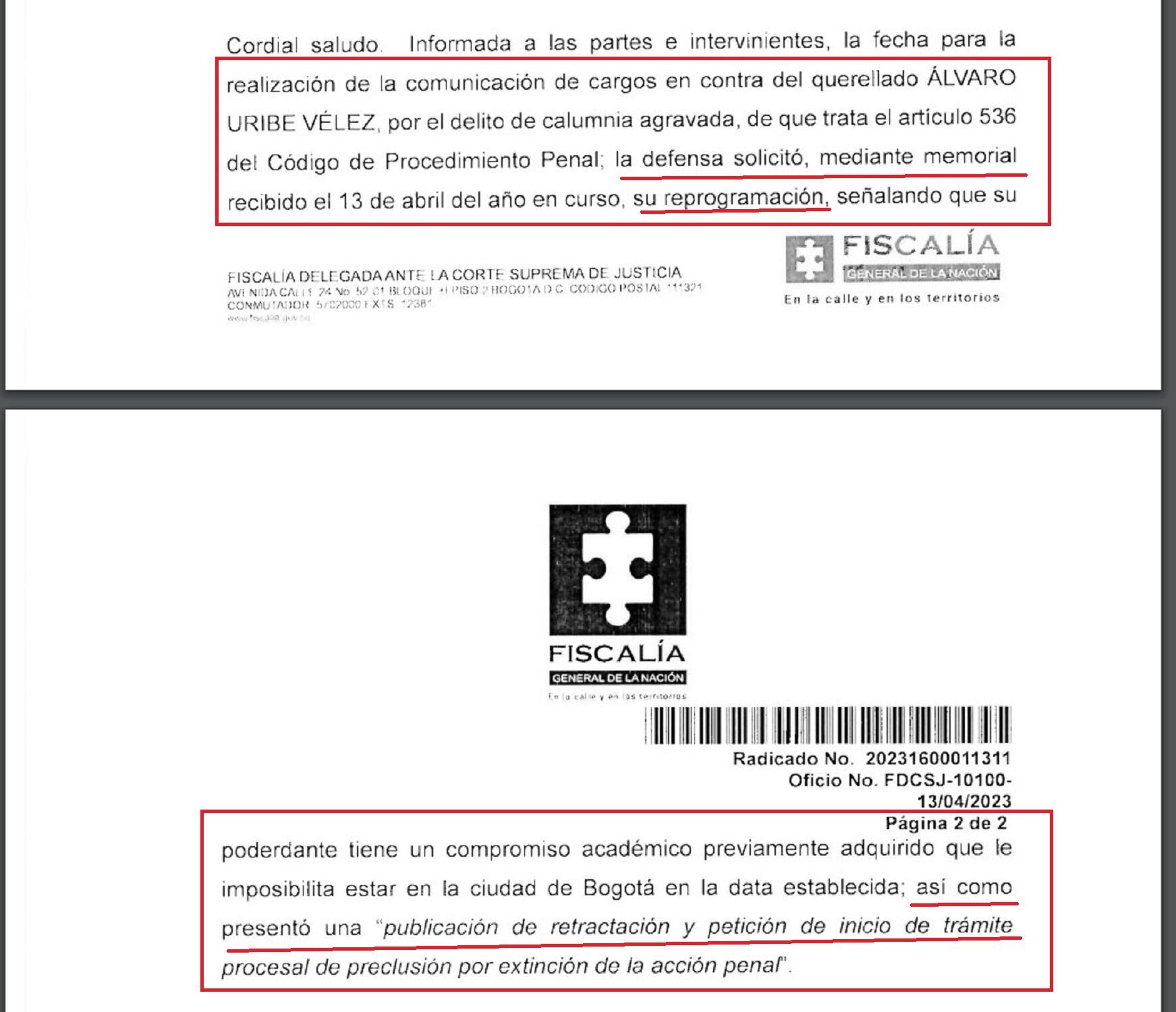 El fiscal Octavo delegado ante la Corte Suprema de Justicia explicó en un oficio que la defensa del exmandatario presentó un memorial el que se excusó y solicitó la reprogramación argumentando que tenía un compromiso académico “previamente adquirido” lo que le imposibilita estar en Bogotá.