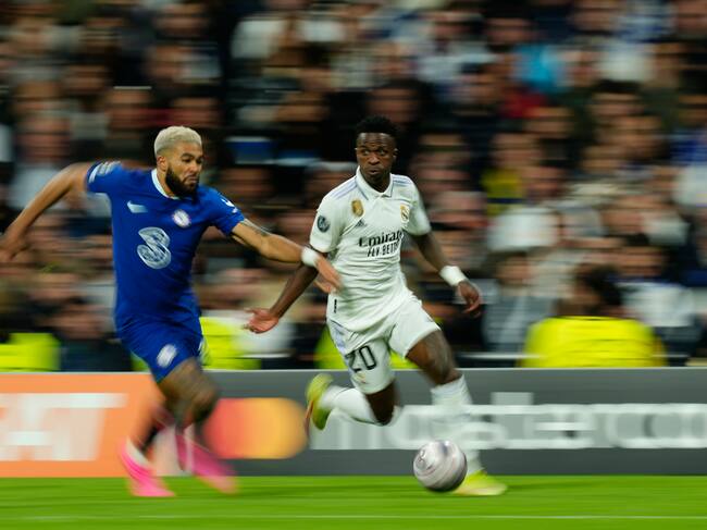 Reece James right-back of Chelsea and England and Vinicius Junior left winger of Real Madrid and Brazil compete for the ball during the UEFA Champions League quarterfinal first leg match between Real Madrid and Chelsea FC at Estadio Santiago Bernabeu on April 12, 2023 in Madrid, Spain. (Photo by Jose Breton/Pics Action/NurPhoto via Getty Images) / NurPhoto