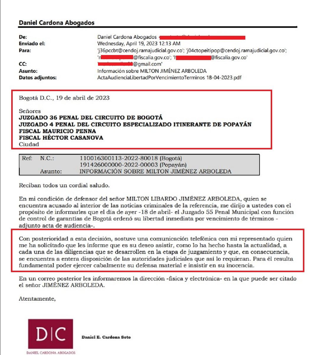 En un correo dirigido a los jueces y a la Fiscalía, la defensa Milton Libardo Jiménez, el guardia del INPEC implicado en la fuga del narco ‘Matamba’ asegura que su cliente no va a huir de la justicia tras recuperar la libertad por vencimiento de términos.