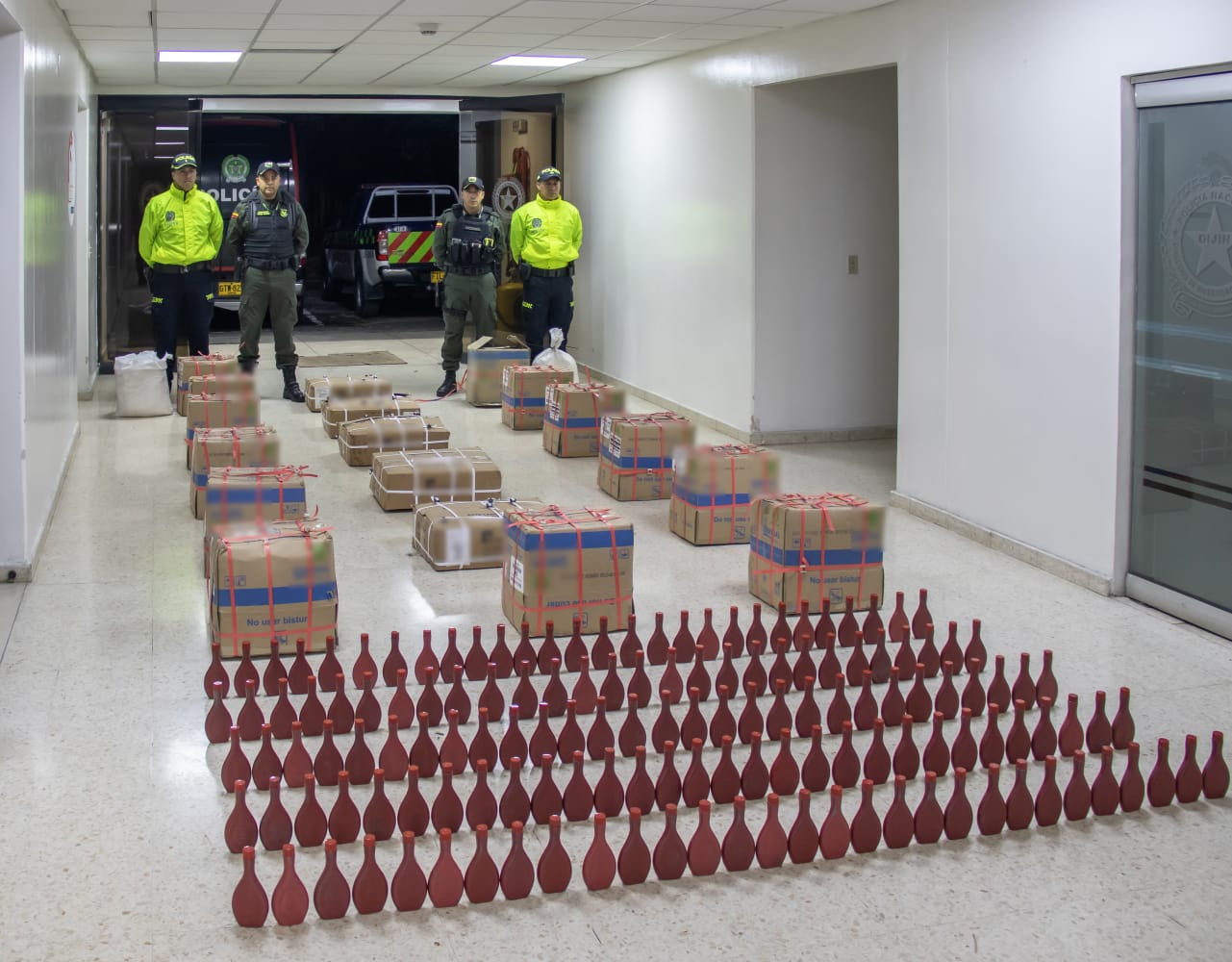 De acuerdo con la brigadier general, Olga Patricia Salazar Sánchez, directora de la DIJIN, en total se incautaron 42 bultos de 25 kg cada uno, para un total de 1.050 kg de clorato de potasio y 145 contenedores de 100 g cada uno, para un total de 14.5 kg de pólvora negra.
