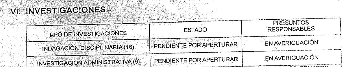 De este informe, se establecieron 16 posibles indagaciones disciplinarias y otras 9 posibles investigaciones administrativas, todas ‘pendientes por aperturar’ y en ‘averiguación de presuntos responsables’.