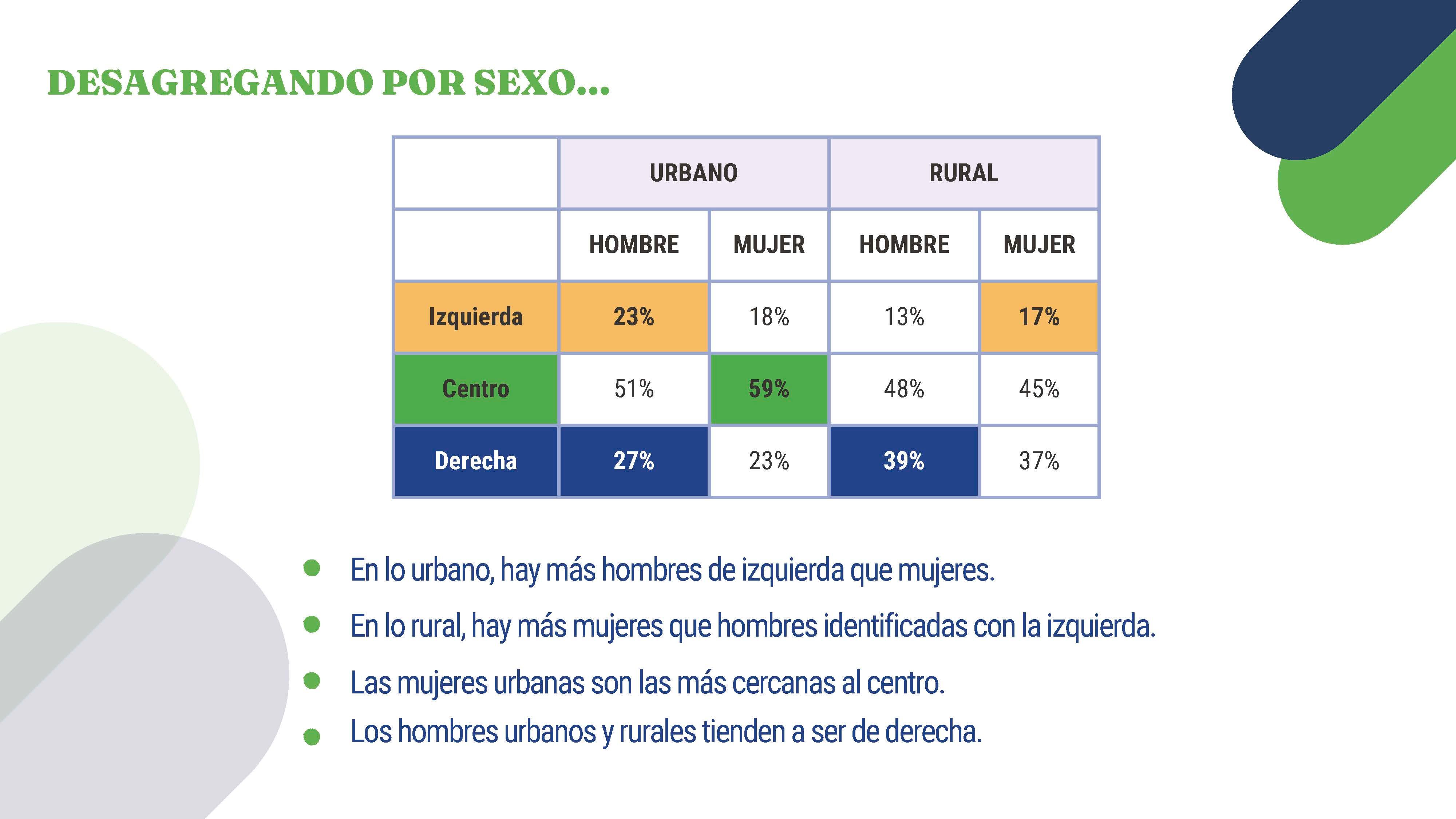 Sin embargo la mayoría de hombres y mujeres tanto de la zona urbana como rural, prefieren la ideología política de centro.