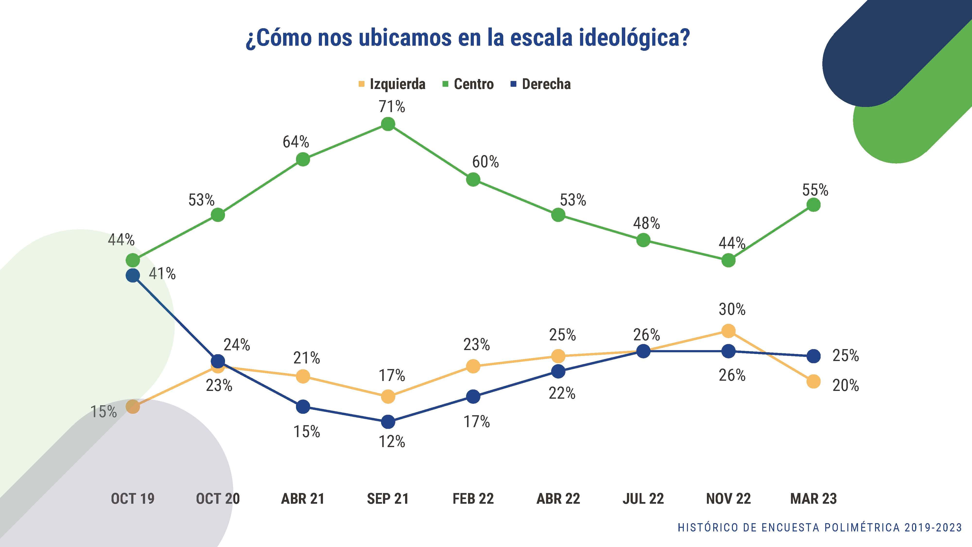 Actualmente los simpatizantes de la izquierda están en un 20%, quienes se identifican con la posición ideológica de derecha son el 25%, mientras que el 55% que lidera la encuesta van por el centro.