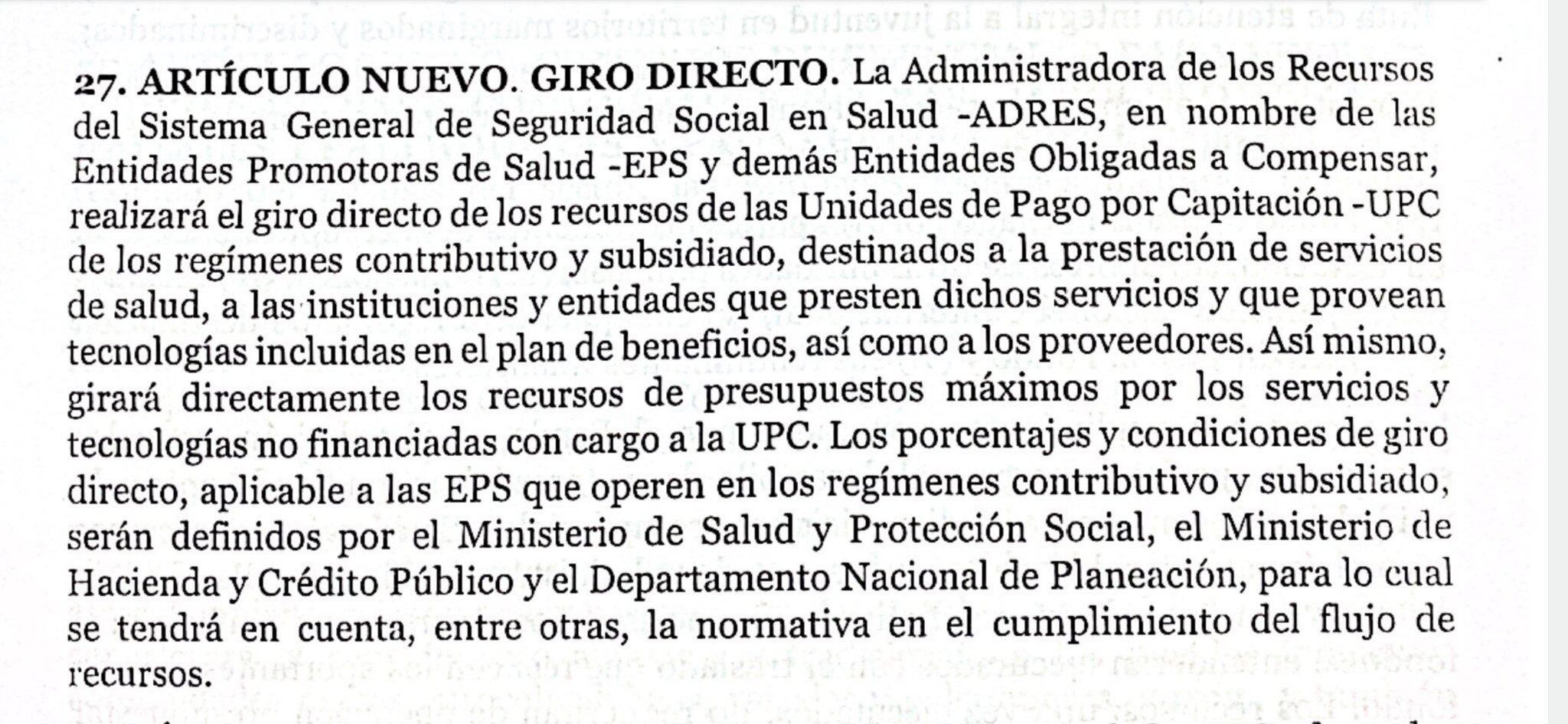 El otro es que la Adres realice el giro directo a las instituciones y entidades que presten servicios de salud. Es decir, minimizan el papel de las EPS. Este es interpretado por algunos como el ‘as bajo la manga’ del Gobierno en caso de que se enrede la reforma a la salud.