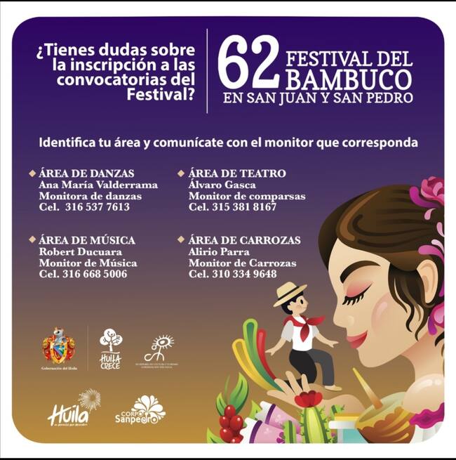 Artistas y personas gestoras y creadoras de la cultura de todo el departamento del Huila pueden desde ya inscribirse para participar en las rondas clasificatorias que permitirán seleccionar a quienes harán parte de la edición 62 del Festival del Bambuco en San Juan y San Pedro, anunciaron la Secretaría departamental de Cultura y Turismo, y la Corporación para la Promoción de la Cultura y el Turismo del Huila, CORPOSANPEDRO.