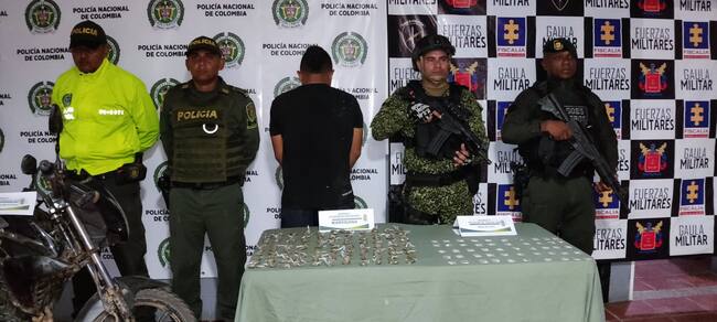 De manera simultánea, fue sorprendido un hombre de 24 años de edad, oriundo de Antioquia, quien se movilizaba en una motocicleta el cual atendió la señal de pare de las autoridades, sin embargo, al momento de realizarle una requisa, se le halló en su poder una bolsa de color negro que en su interior contenía 100 bolsitas con material vegetal, que por sus características de color y olor se asemejaba a la marihuana y otras 50 bolsitas más, con sustancia en polvo de color blanco, que se asemejaba a base de coca por su olor y color.