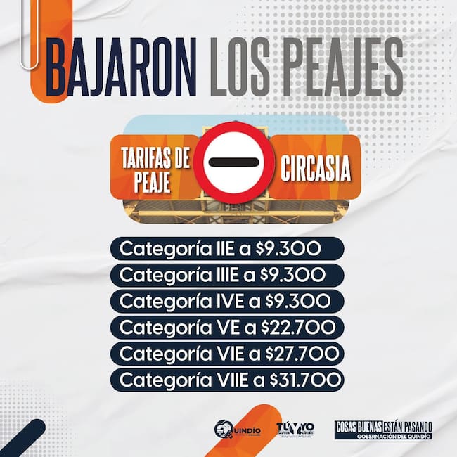 Mientras para Cerritos la disminución en el precio del peaje baja para todas las categorías un 58% en el peaje de Circasia en autopistas del café en la vía Armenia - Pereira no incluye a la categoría 1 que es vehículos particulares y camperos.