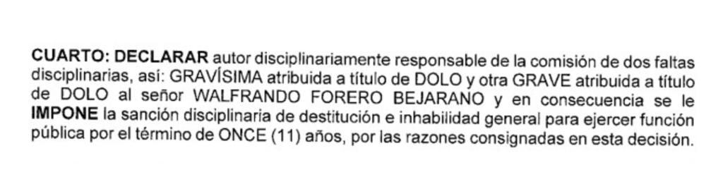 De acuerdo con el fallo de la Procuraduría General de la Nación, la falta que cometió el funcionario fue gravísima a título de dolo y en consecuencia se le impuso una sanción disciplinaria de once años.