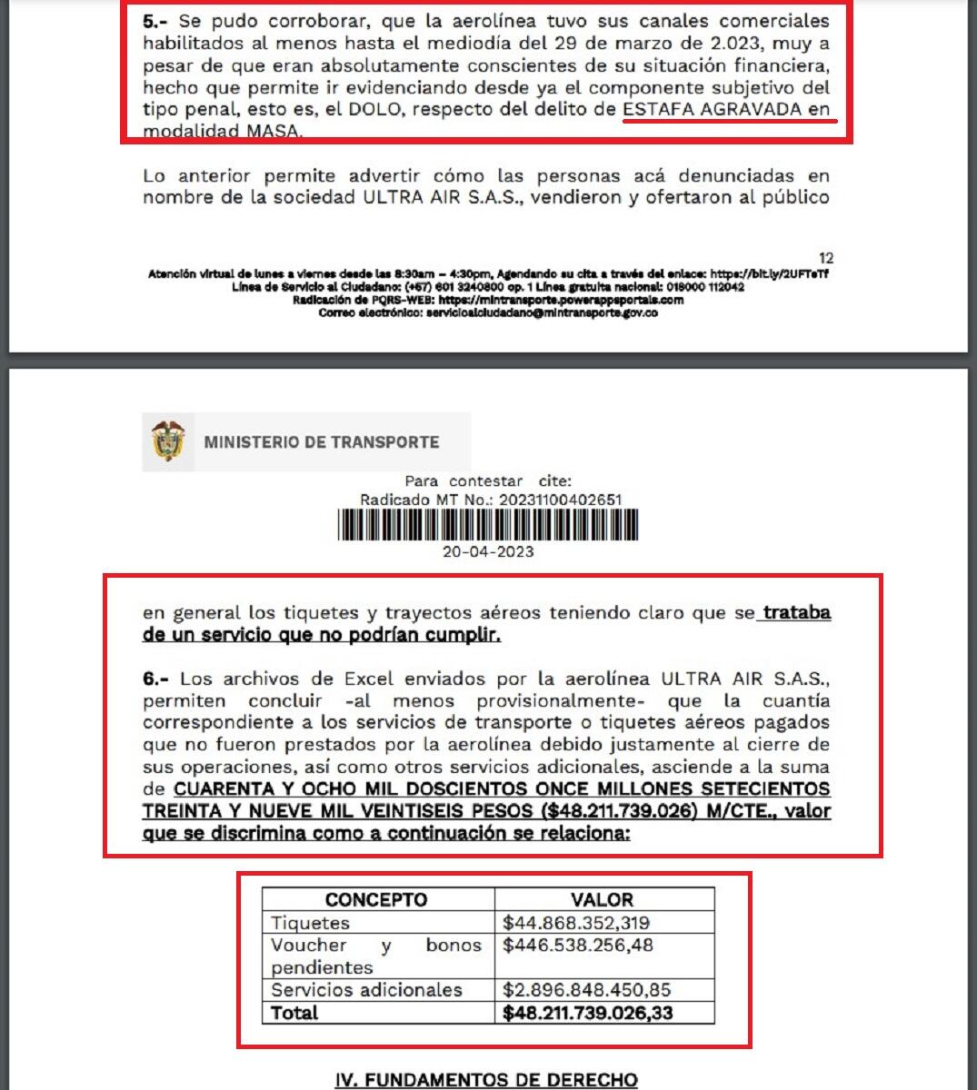 “Lo anterior permite advertir cómo las personas acá denunciadas en nombre de la sociedad ULTRA AIR S.A.S., vendieron y ofertaron al público en general los tiquetes y trayectos aéreos teniendo claro que se trataba de un servicio que no podrían cumplir”, indica el documento.