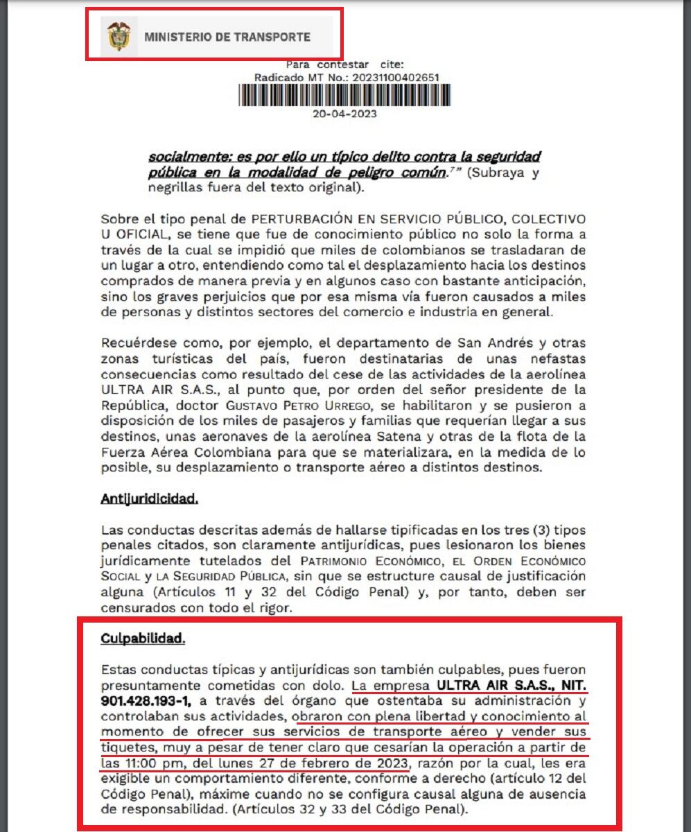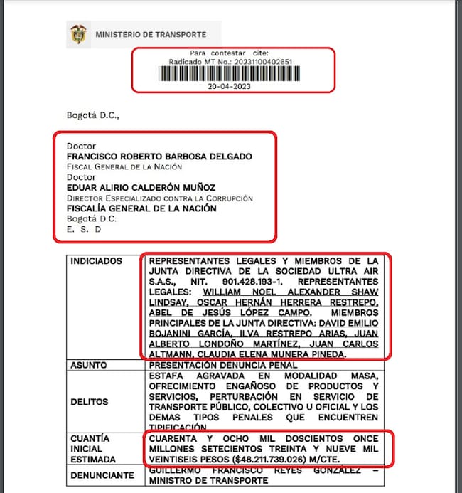 Gobierno denunció ante la Fiscalía a directivos de Ultra Air . El ministerio de Transporte pide que se investigue a la junta directiva de esa aerolínea por estafa en masa en más de $48 mil millones