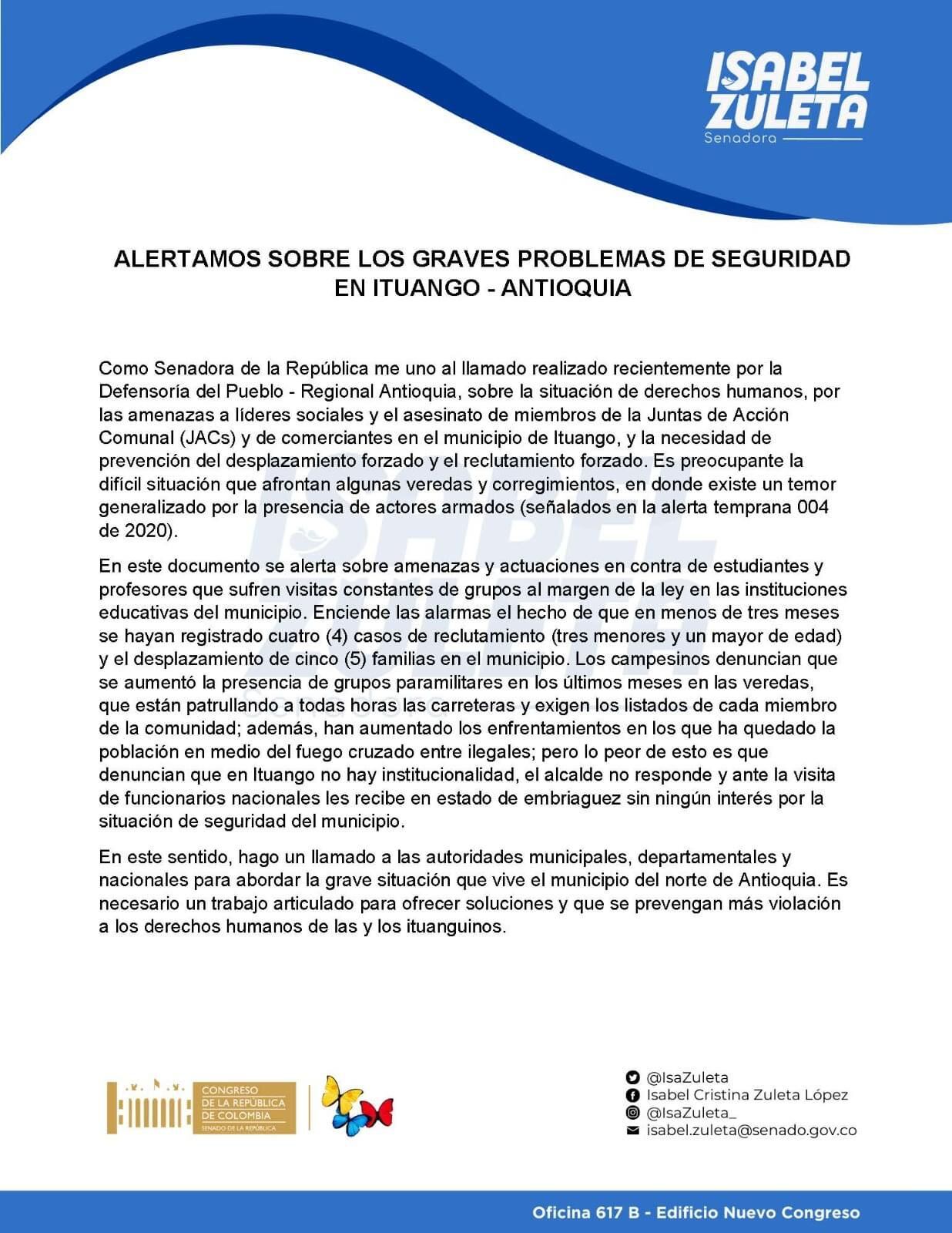 En un comunicado la Senadora antioqueña Isabel Zuleta y oriunda del municipio de Ituango, manifestó su preocupación por la actual situación de seguridad que afronta ese territorio del Norte de Antioquia por cuenta de los grupos armados ilegales que están en el territorio.