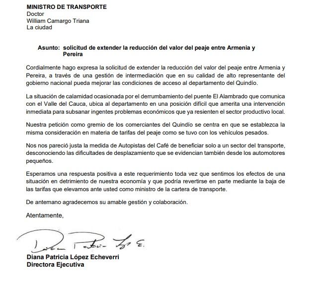 La directora del gremio de los comerciantes en el departamento, Diana López, indicó que enviaron una nueva solicitud al recién designado ministro de Transporte William Camargo para que se generen las condiciones de equidad en reducción a todos los vehículos que transitan en el peaje de Circasia ubicado entre Armenia y Pereira.