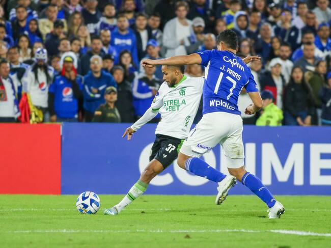 Jorge Arias of Millonarios (COL) and Everaldo of America F. C. (BRA) fight for the ball in the match between Millonarios F. C. (COL) and America F. C. (BRA) of the group stage date 3 of group F between Millonarios F. C. (COL) and America F. C. (BRA) for the CONMEBOL South American Cup 2023 at the Nemesio Camacho El Campin stadium in the city of Bogota. (Photo by Daniel Garzon Herazo/NurPhoto via Getty Images) / NurPhoto