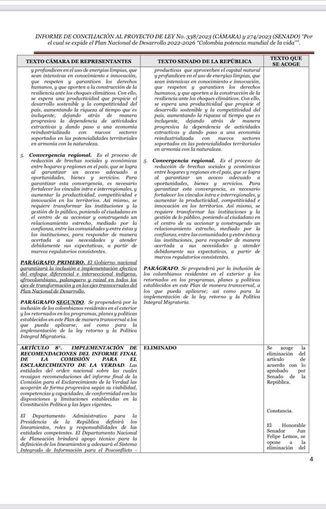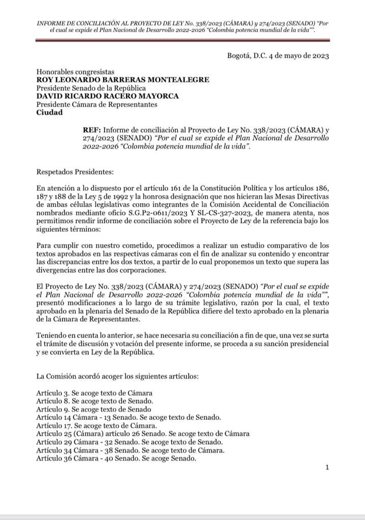 Luego de la aprobación del Plan Nacional de Desarrollo: ‘Colombia, potencia mundial de la vida’, se reunieron tres representantes de la Cámara y tres senadores, que elaboraron el informe de conciliación final, que fue aprobado en una sesión presidida por el Senador Honorio Enríquez, y ahora pasará a sanción presidencial.