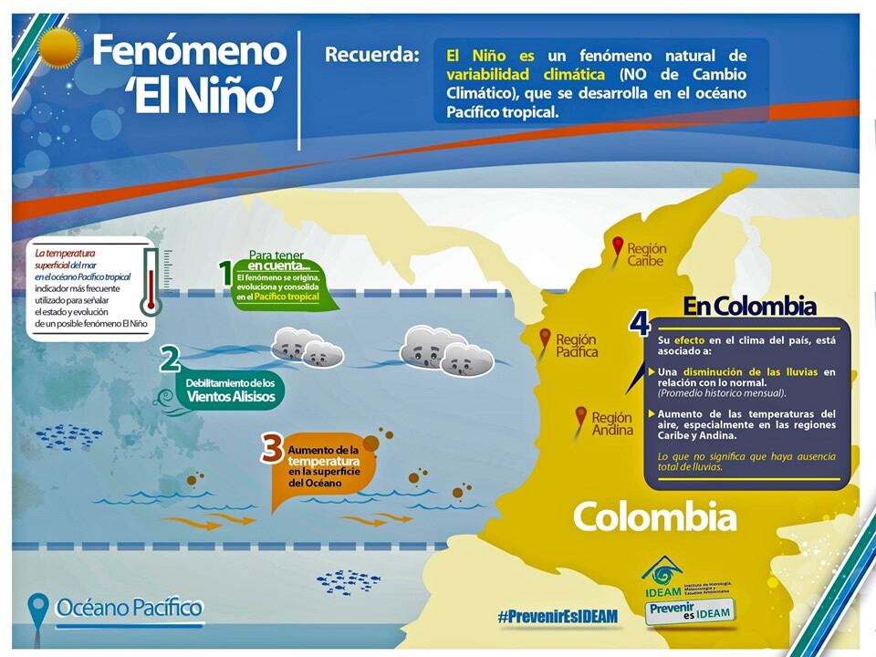 Así mismo, el Ideam afirmó que El Niño puede tener incidencia en el patron de siembra ya que daña los cultivos, afectando a su vez la seguridad alimentaria del país. También tiene consecuencias directas en la disponibilidad del recurso hídrico, por lo que recomiendan la economización del agua en cada hogar.