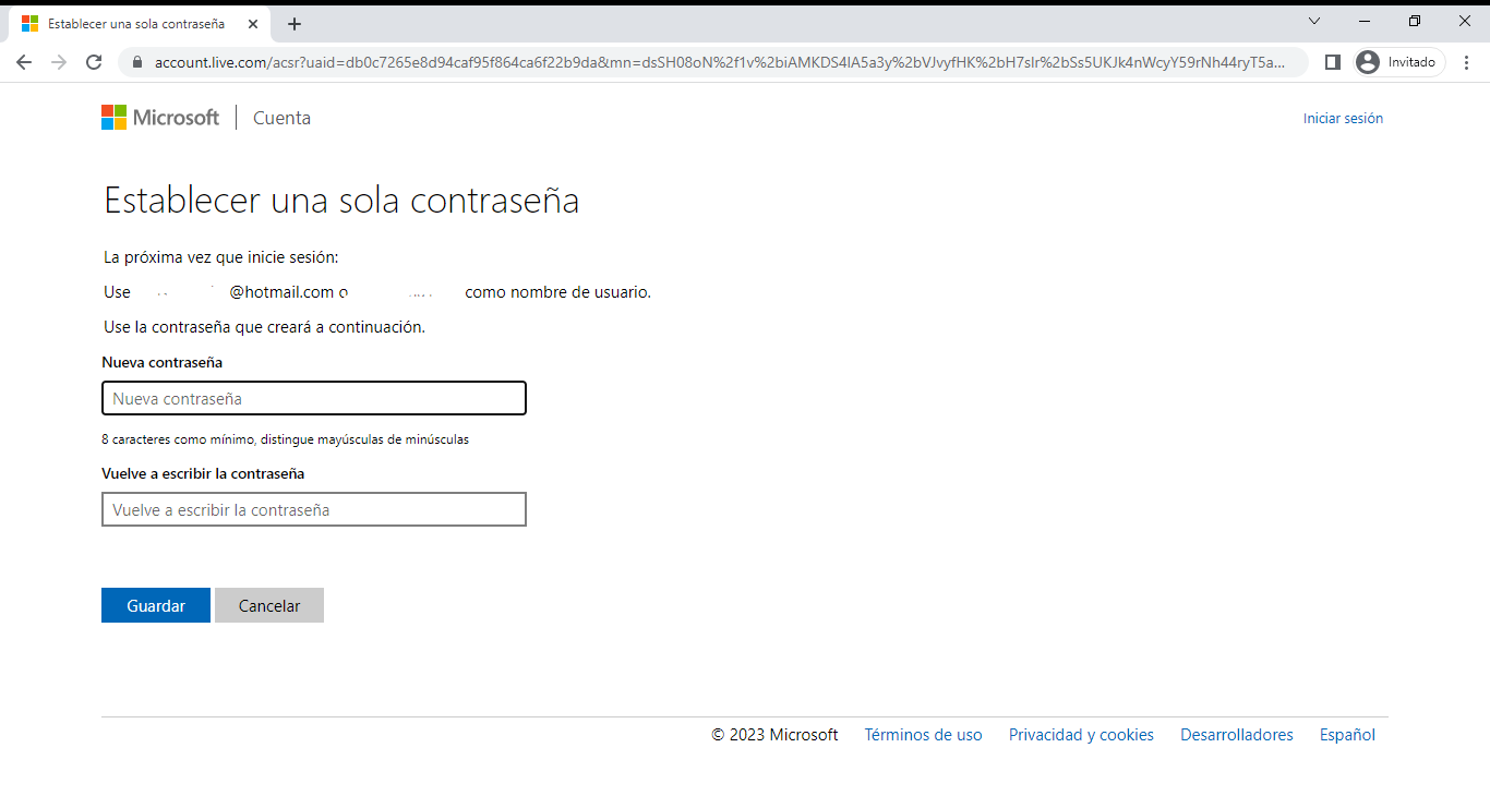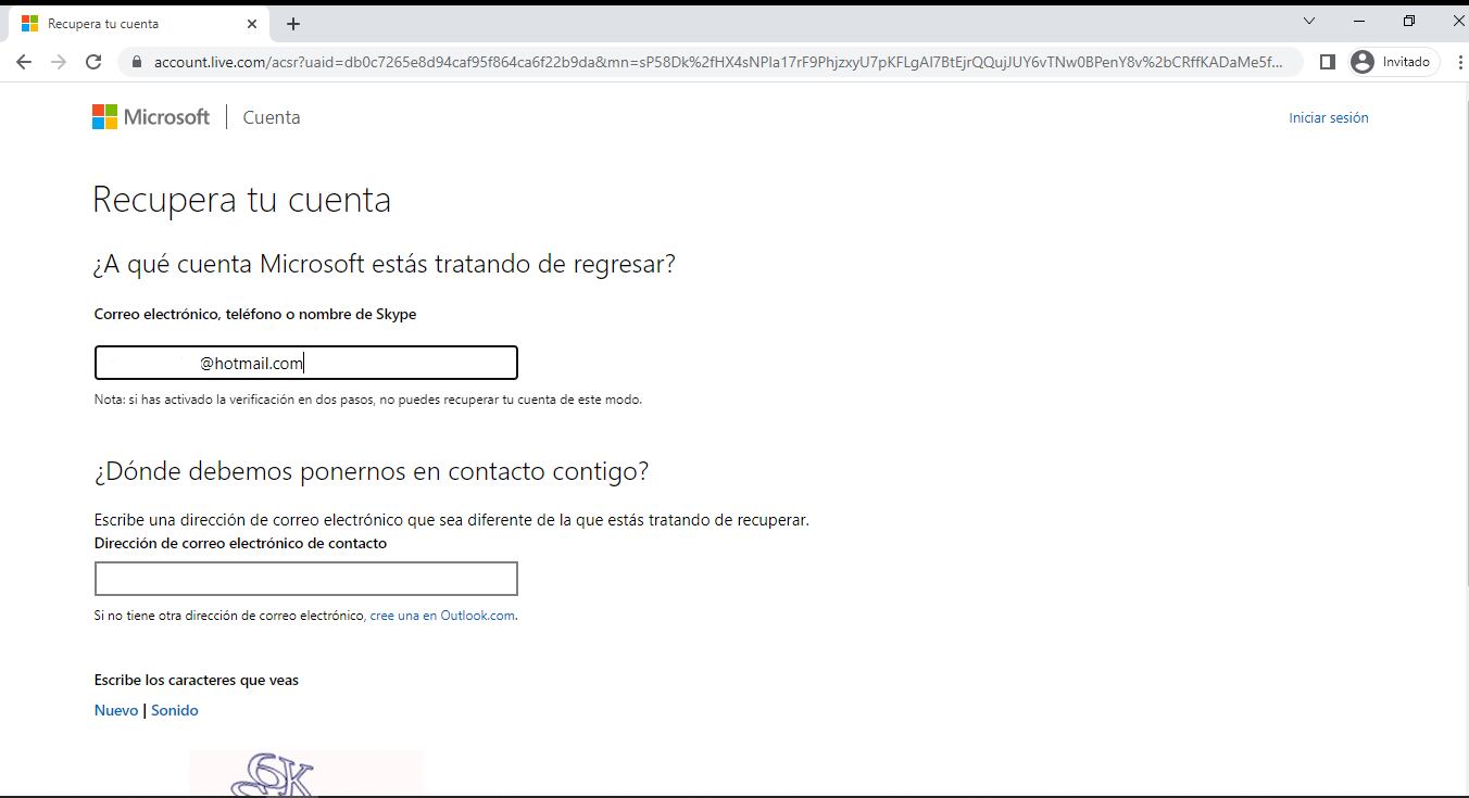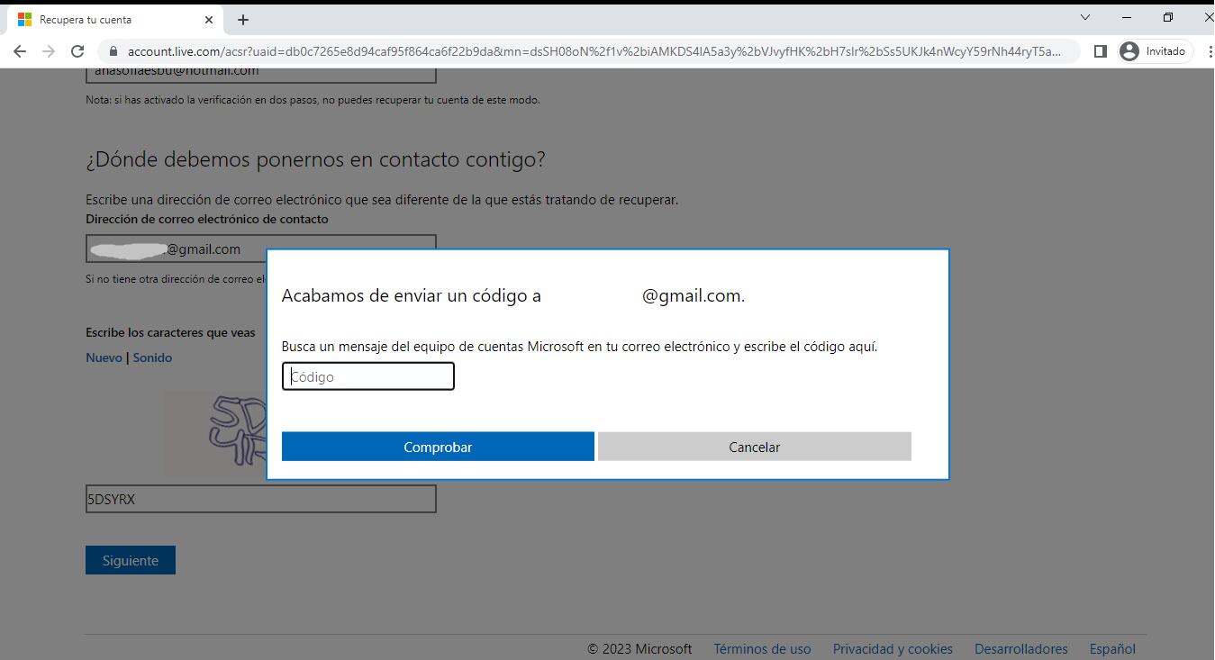 - Después de ingresar en este segundo correo deberá digitar el código que le enviaron en Hotmail.