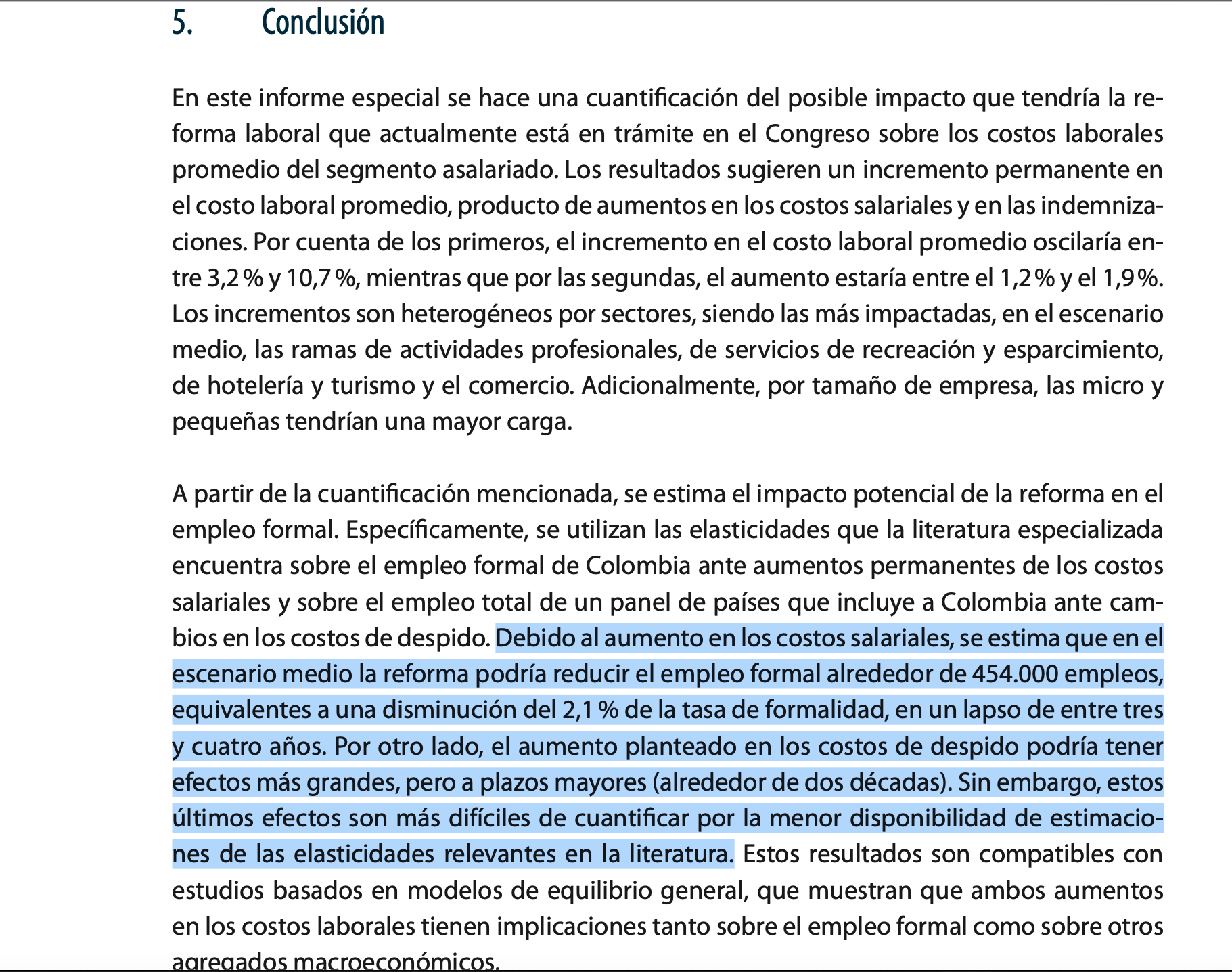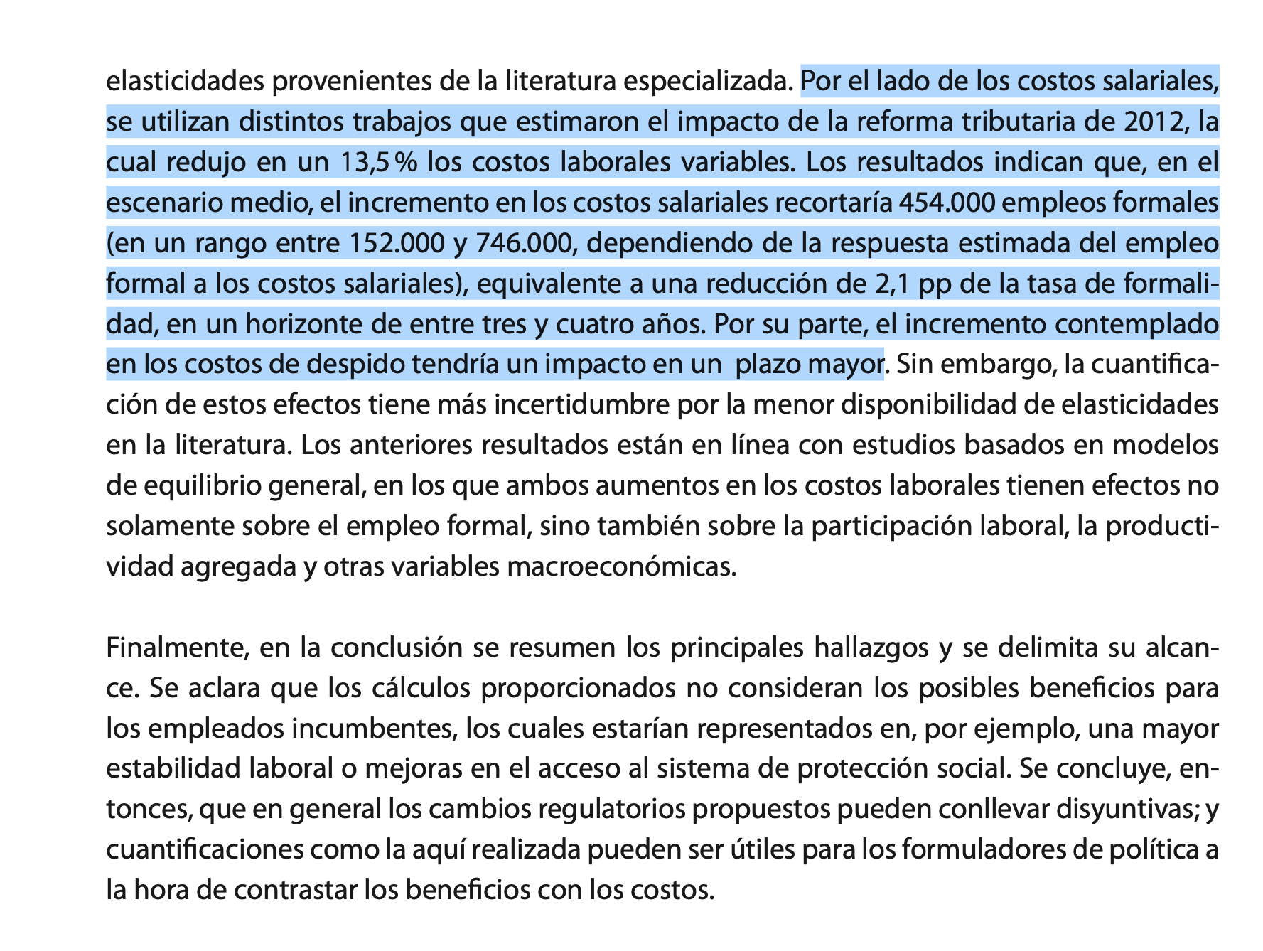 Dice el reporte, publicado por el Banco de la República en su cuenta de Twitter, que la reforma también daría una “mayor estabilidad laboral o de mejoras en el acceso al sistema de protección social”. Además aclara que “los cálculos proporcionados no consideran los posibles beneficios para los empleados incumbentes”, pero menciona que generaría una mayor estabilidad laboral o mejoras en el acceso al sistema de protección social.