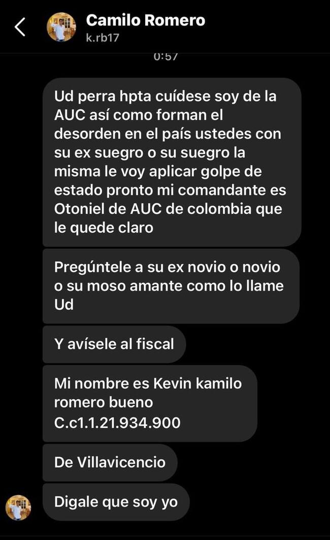 El individuo utiliza palabras irrespetuosas, le dice que se cuide y hace referencia incluso a quien dice su exsuegro, quien sería el presidente Gustavo Petro.