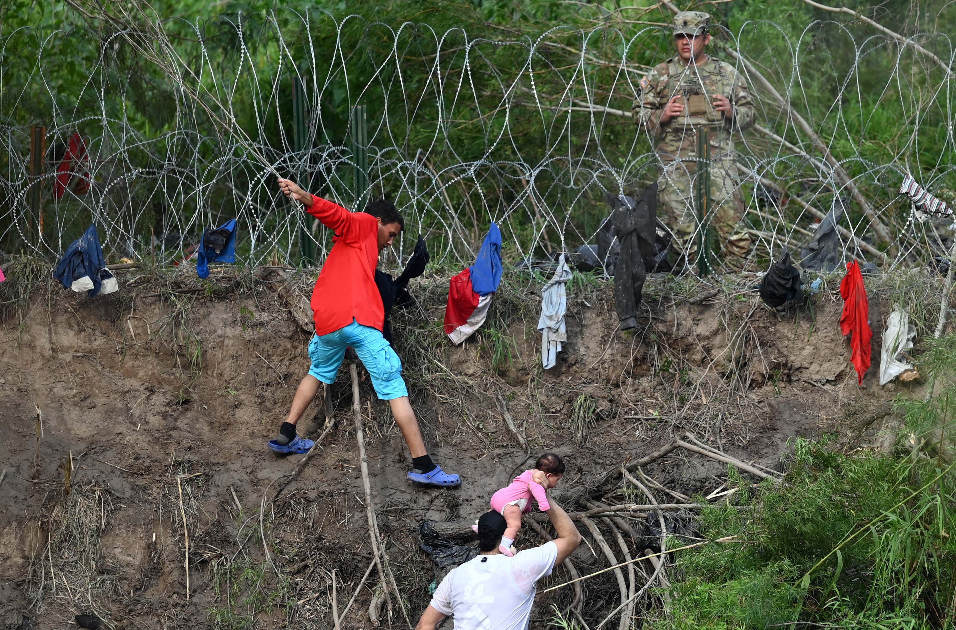 TOPSHOT - Migrant people try to get to the US through the Rio Grande, which is reinforced with a barbed-wire fence, as seen from Matamoros, state of Tamaulipas, Mexico on May 10, 2023. A surge of migrants is expected at the US-Mexico border cities as President Biden administration is officially ending its use of Title 42. On May 11, President Joe Biden's administration will lift Title 42, the strict protocol implemented by previous president Donald Trump to deny entry to migrants and expel asylum seekers based on the Covid pandemic emergency. (Photo by ALFREDO ESTRELLA / AFP) (Photo by ALFREDO ESTRELLA/AFP via Getty Images) / ALFREDO ESTRELLA