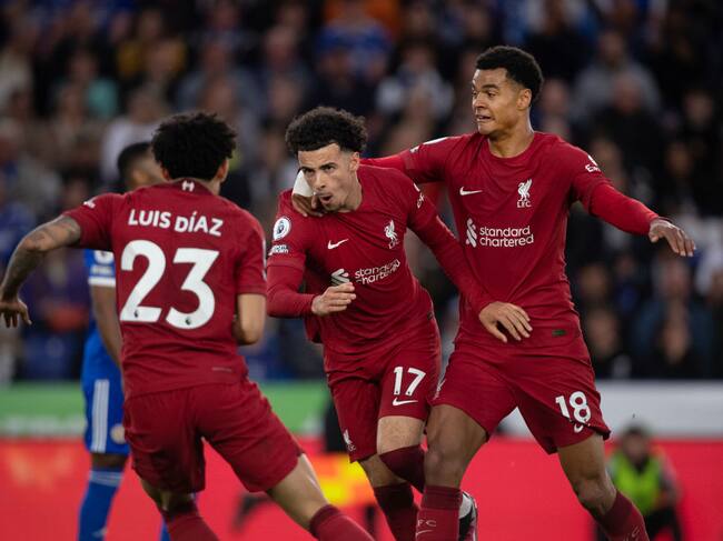 Luis Diaz celebra con sus compañeros en el partido ante Leicester. Getty Images / Visionhaus