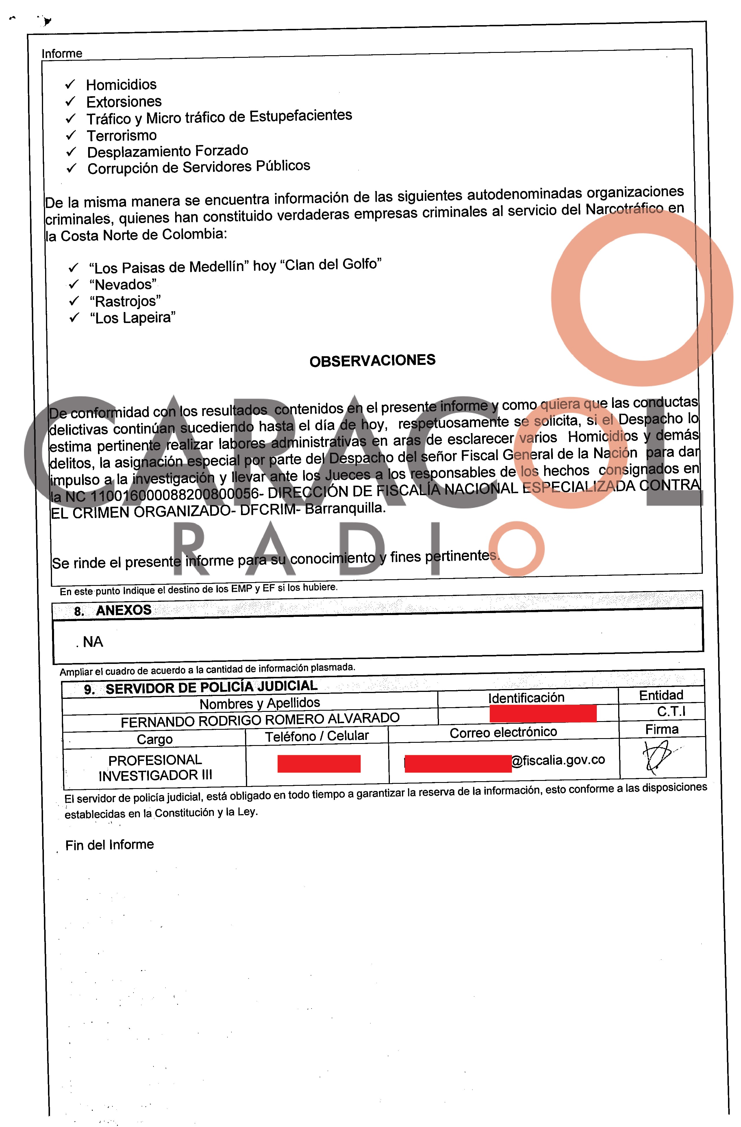 Caracol Radio revela el documento que probaría que, un investigador de la Fiscalía nunca dio cuenta de 200 homicidios atribuidos al ‘clan del Golfo’ entre el 2008 y 2010. Solo reportó la interceptación de 200 líneas de celulares.