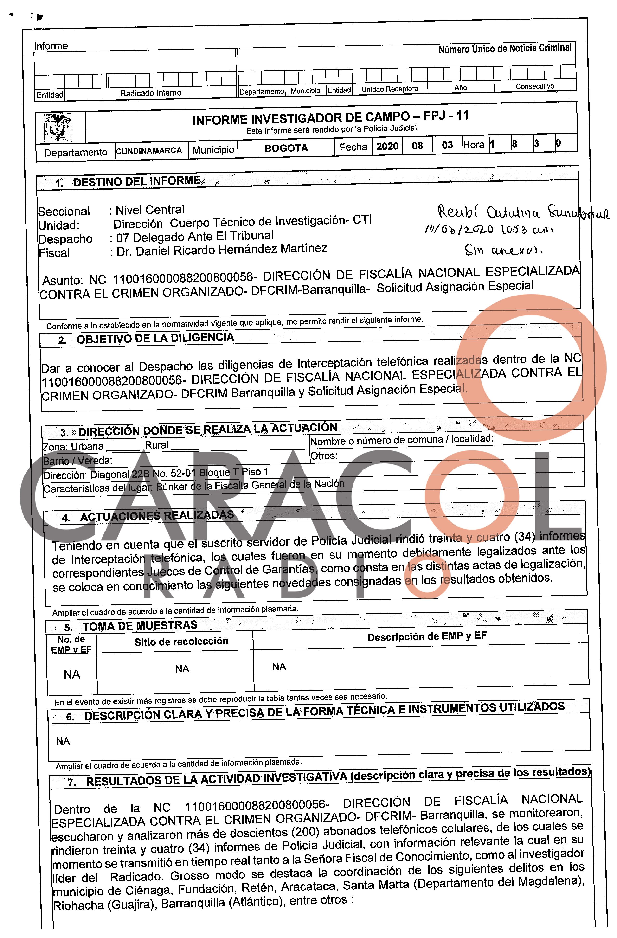 La semana pasada en Caracol Radio revelamos un acta de la Fiscalía con fecha de noviembre de 2021, en donde el fiscal Hernández llamó la atención del investigador, porque pasó más de un año y nunca entregó pruebas.