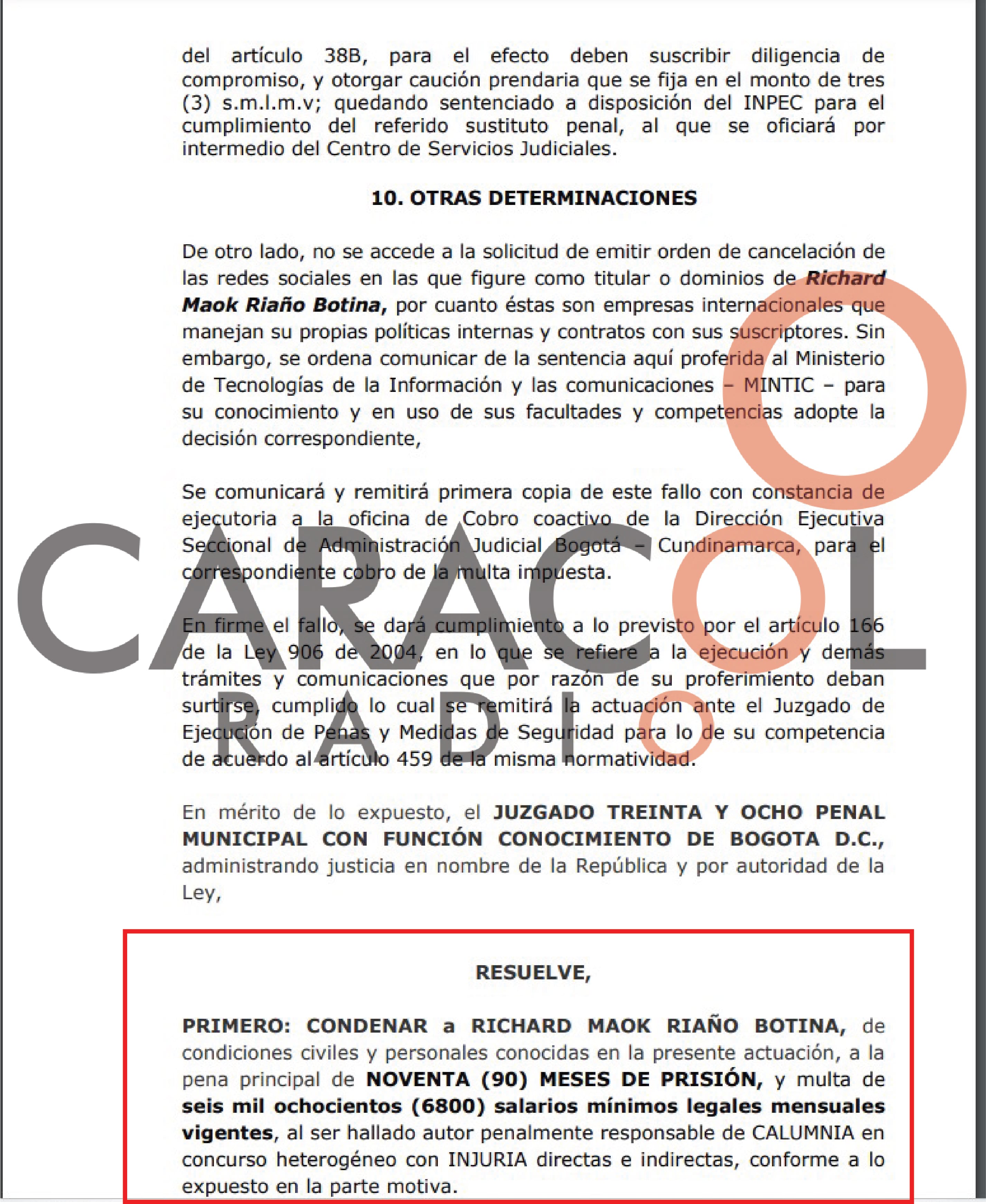 El fallo condena a Maok Botina a pagar 6.800 SMLMV y se abstuvo se ordenar el cierre de sus redes sociales.
