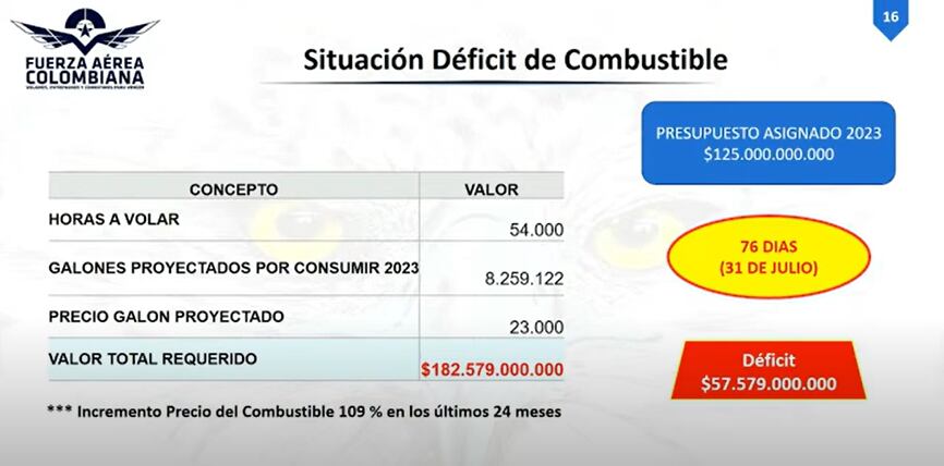 Y aquí viene la alerta: este año se tienen proyectadas 54 mil horas de vuelo, es decir se necesitan 8.259.000 galones de combustible que cuestan $182.000 millones, pero recibieron $125.000 millones. El hueco es grande, el déficit es superior a los $57 mil millones.