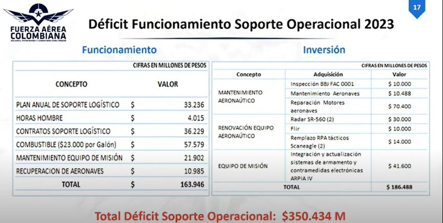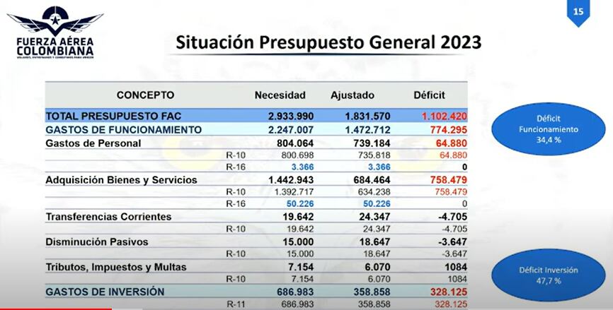 El general Carlos Silva, jefe de Estado Mayor de la FAC, detalló en el Congreso lo que se necesita para funcionamiento e inversión. “Nuestra necesidad son $2.900 millones, pero recibimos $1.831 millones, es decir, que tenemos un déficit $1.102 millones”, indicó.