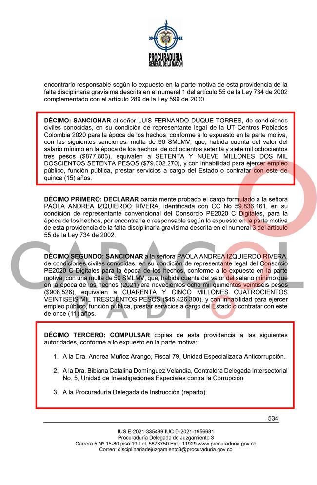 Caracol Radio revela el fallo de la Procuraduría General que impone las primeras sanciones disciplinarias en contra tres exfuncionarios del MinTICs, y dos excontratistas por el caso de corrupción Centros Poblados.