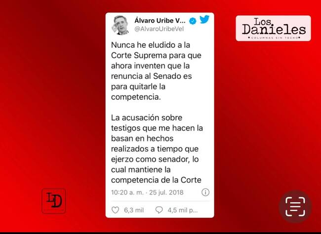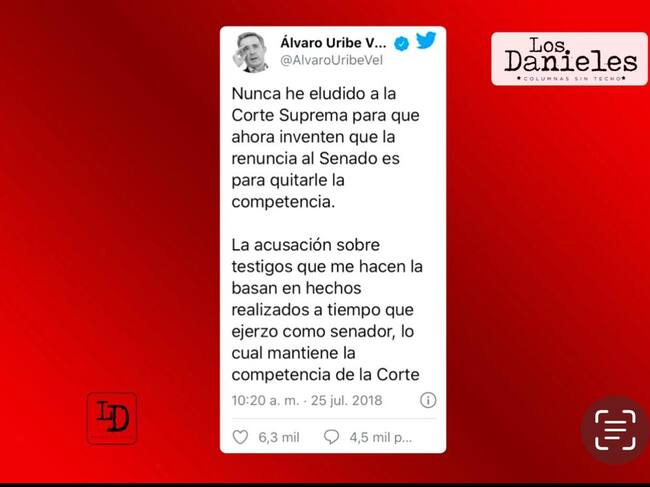 Un trino suyo desnuda que dice unas cosas y hace otras. Leo el mensaje del señor expresidente “Nunca he eludido a la Corte Suprema para que ahora inventen que la renuncia al Senado es para quitarle competencia. La acusación sobre testigos que me hacen la basan en hechos realizados a tiempo que ejerzo como senador, lo cual mantiene la competencia de la Corte”.