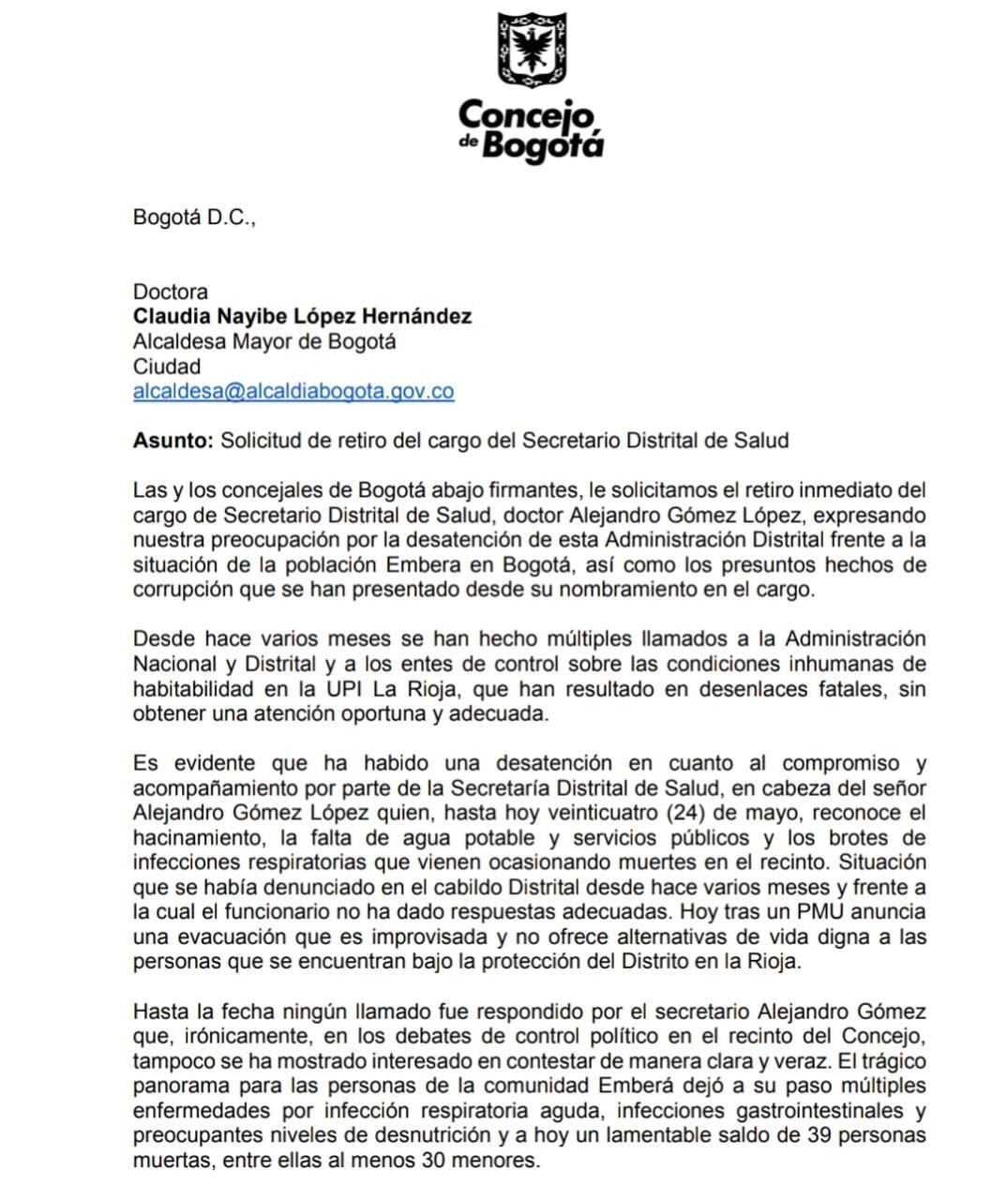 Carta de 12 concejales de Bogotá exigiendo la renuncia del secretario de Salud, Alejandro Gómez.