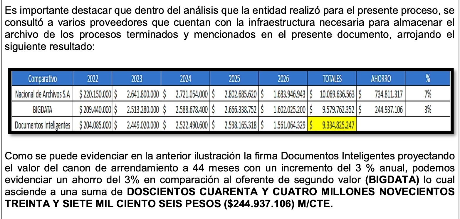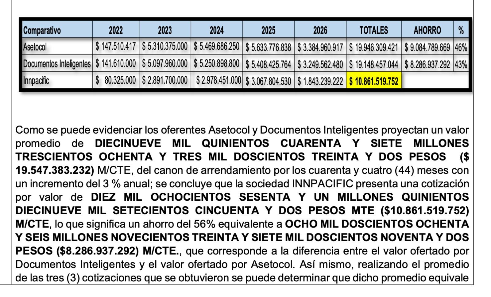 Para el contrato de Innpacific se tuvieron en cuenta las cotizaciones de la firma Documentos Inteligentes, a la que se le adjudicaron otros 2 contratos por el mismo objeto, pero con un monto muy superior. Mientras Innpacific cobró 987 por cada caja, Documentos Inteligentes cotiza $2.122 por cada una, más del doble que su competidor.