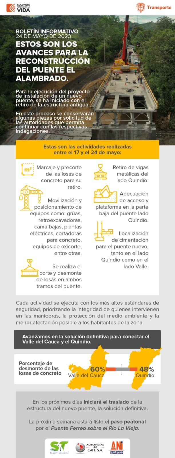 Cabe recordar que según las autoridades y el consorcio autopistas del café esperan que el 11 de octubre este instalado el nuevo puente en el sector del Alambrado.