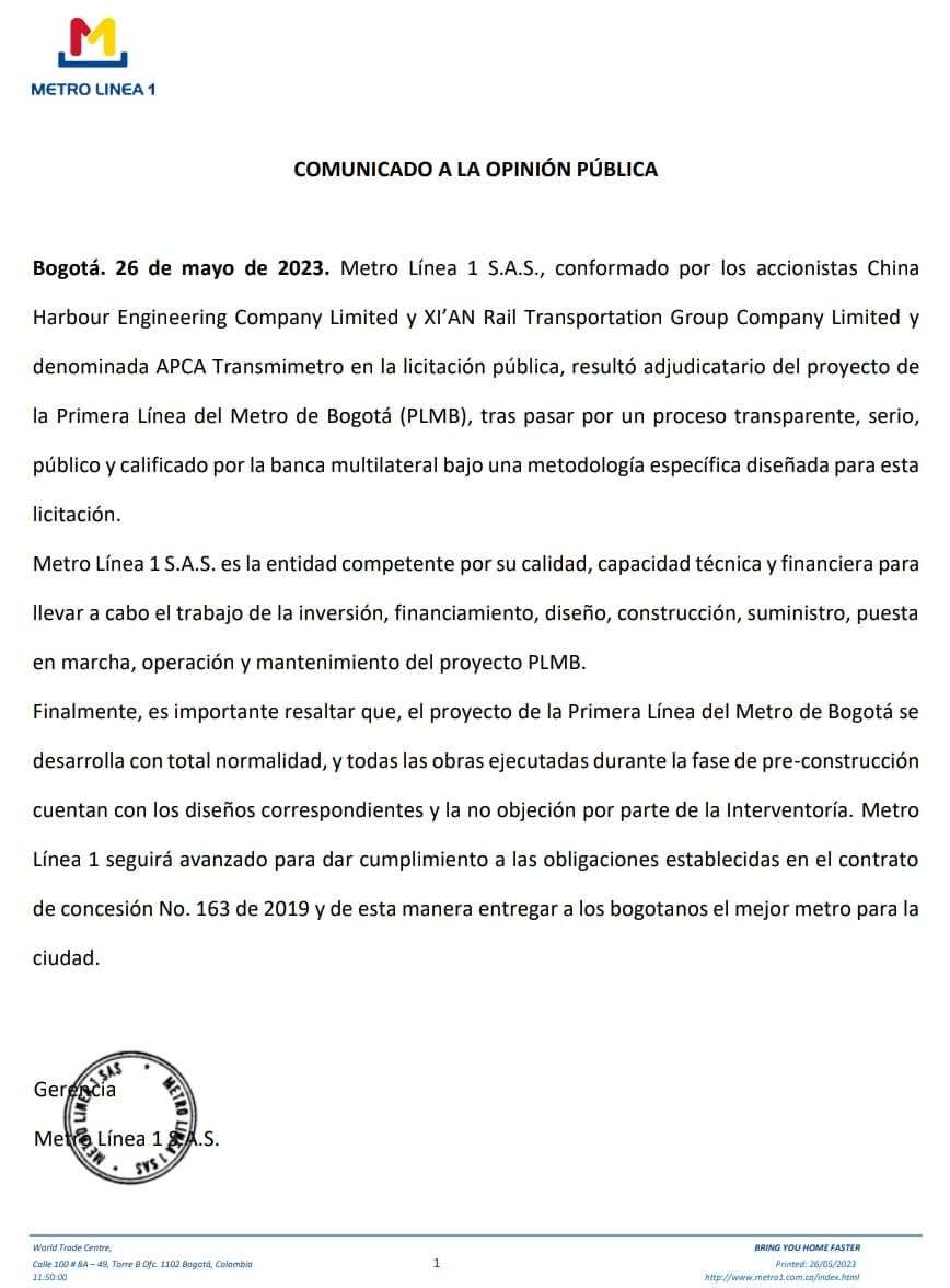 El consorcio recalcó que “todas las obras ejecutadas durante la fase de pre-construcción cuentan con los diseños correspondientes y la no objeción por parte de la Interventoría”. Además reiteró que la entidad “resultó ganadora de la licitación del proyecto de la Primera Línea del Metro de Bogotá (PLMB), tras pasar por un proceso transparente, serio, público y calificado por la banca multilateral”.