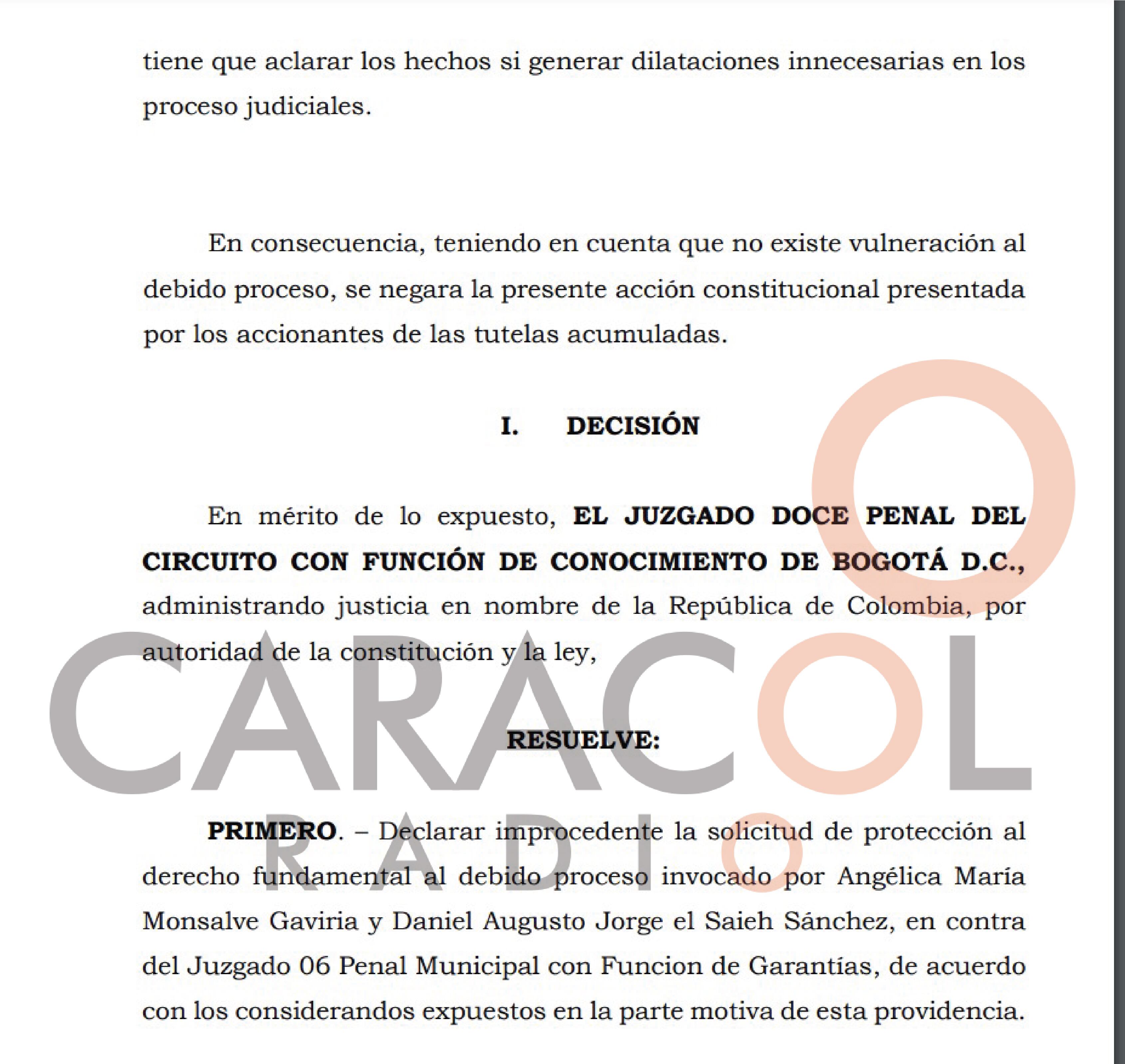 El juzgado 12 de Conocimiento de Bogotá negó la tutela porque la aclaración que pidió la jueza Sexta de Control de Garantías a la Fiscalía, es una orden que simplemente debe cumplirse.