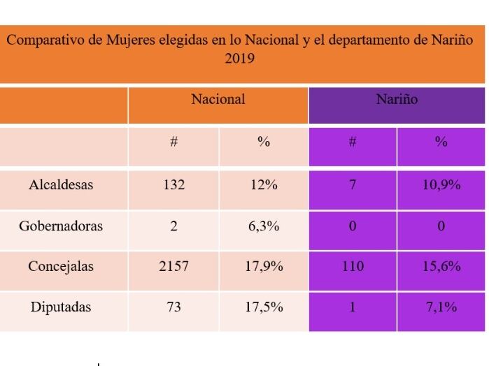 Comparativo de Mujeres elegidas en lo Nacional y el departamento de Nariño 2019