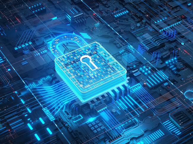 Digital security padlock with encrypted binary code on futuristic circuit board. / Yuichiro Chino