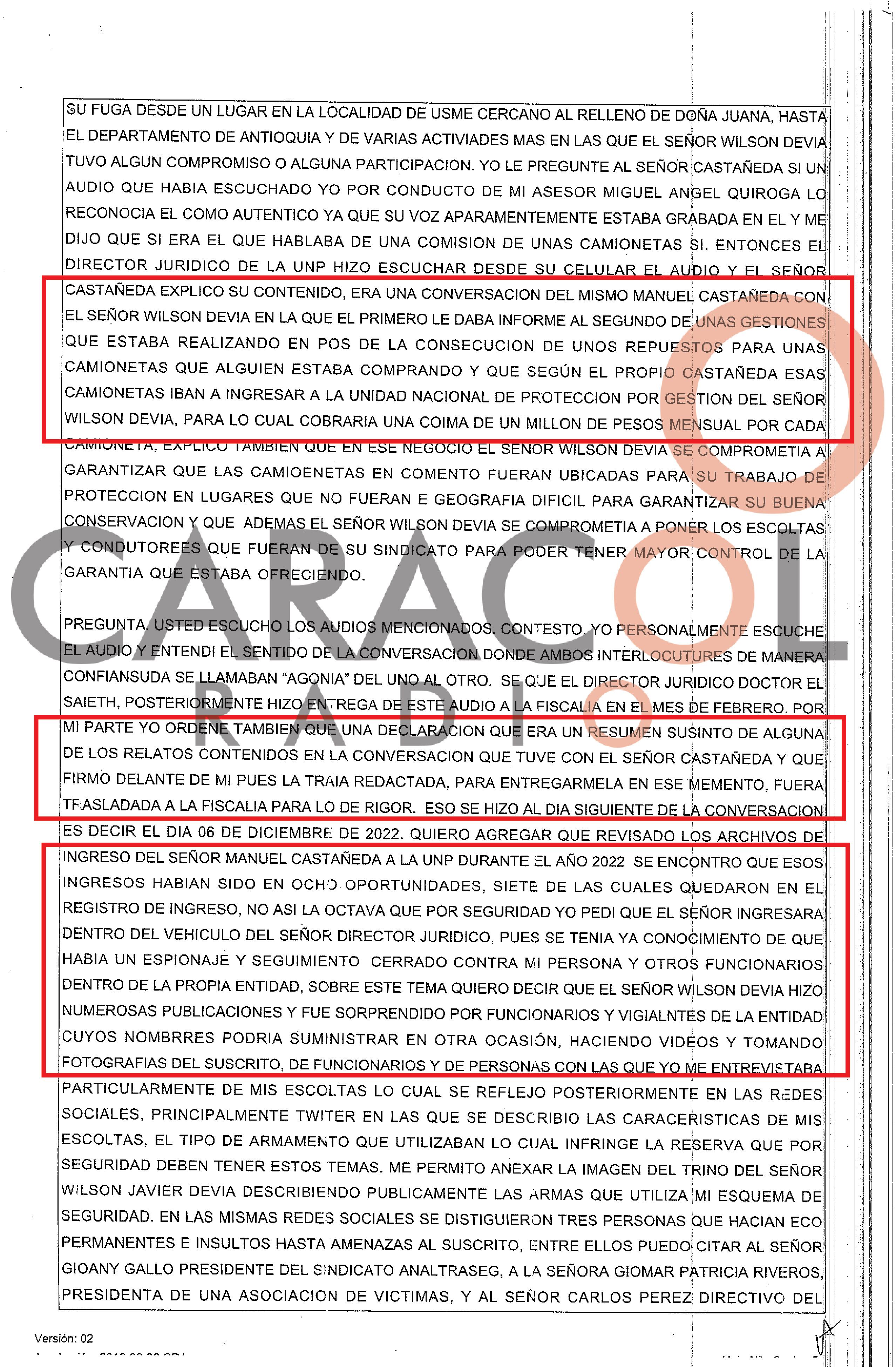 “Según el relato de Castañeda, el señor Wilson Devia le ofreció conseguir un esquema de protección asignado en cabeza del propio Manuel Antonio Castañeda, que le costaría $200 millones que debía entregarle en efectivo al señor Wilson Devia, y que él se encargaría de la consecución oficial. Según Castañeda, a él le pareció costoso y riesgo entregar esta suma al señor Wilson Devia, ante lo cual le propuso una segunda manera de obtener un esquema de protección. Afirma Castañeda que Devia le dijo que podía alquilarle un esquema consistente en un vehículo blindado de la UNP con dos hombres de protección y la compañía del protegido. Titular de ese esquema, el señor Yesid Torres, un desmovilizado de las antiguas FARC, quien podría ser una especie de tercer hombre de protección. Al final, afirmó Castañeda que el negocio se hizo y él tuvo ese esquema a su servicio por más de un año”, dice el documento.