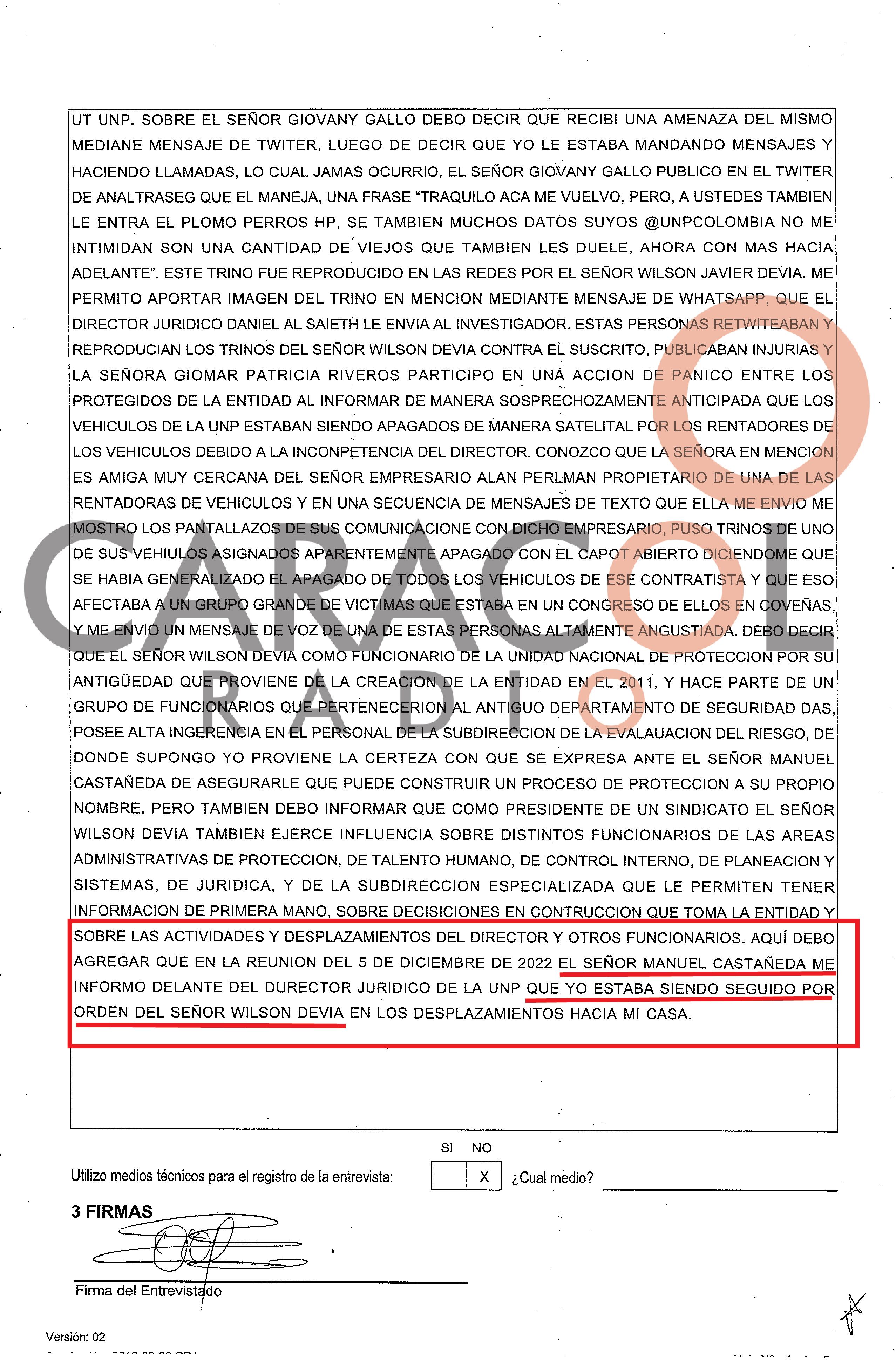 Sobre los señalamientos contra Wilson Devia, dijo que, según el “narco-chofer” Castañeda, el líder sindical de esa entidad, habría ordenado seguir de manera ilegal al director de la UNP.